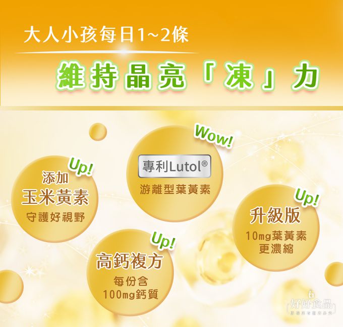 成分:水、砂糖、濃縮蘋果果汁、果凍膠(鹿角菜膠、氯化鉀、蒟蒻粉、刺槐豆膠)、金盞草(花)萃取物〔水、金盞草萃取物、羧甲基纖維素鈣、脂肪酸蔗糖酯、L-抗壞血酸棕櫚酸酯(維生素C)(抗氧化劑)〕(含葉黃素10:玉米黃素2)、乳酸鈣、檸檬酸鈣、檸檬酸、檸檬酸鈉、食用香精