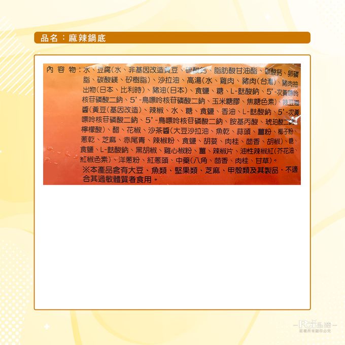 過敏原:本產品含有大豆、魚類、堅果類、芝麻、甲殼類及其製品,不適合其過敏體質者食用。