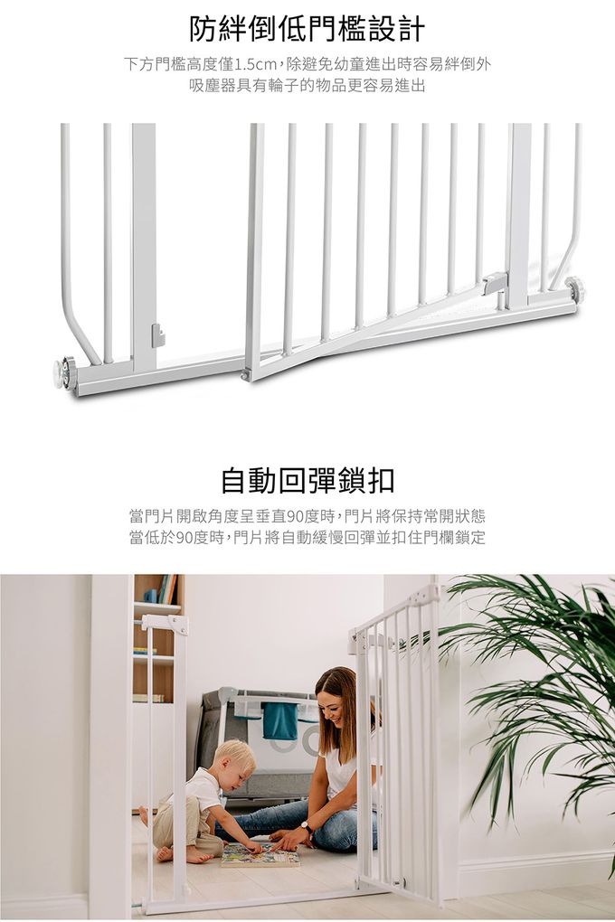 詳細尺寸:兒童門欄主體: W75 x H77cm(適用門框寬度75-85cm) 增加單邊延長片: W95 x H77cm(適用門框寬度85-95cm) 增加雙邊延長片: W105 x 77cm(適用門框寬度95-105cm)