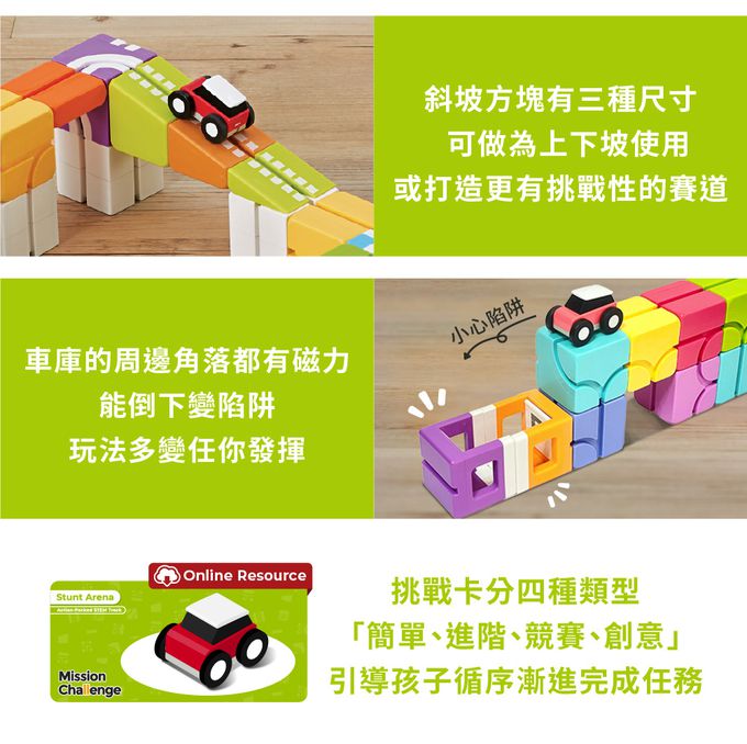 透過積木和軌道組成不同的賽道,高架、轉彎、環狀賽道想怎麼變就怎麼變!