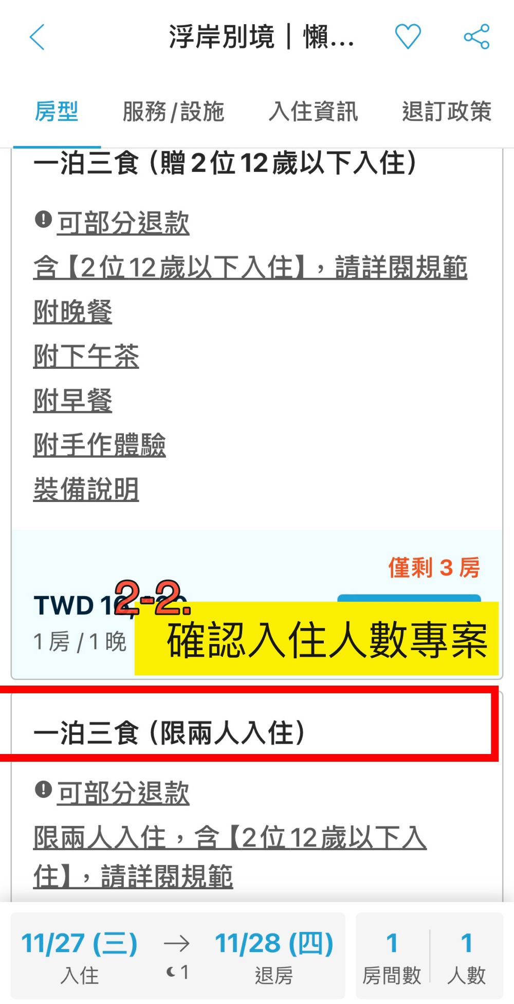 ※ 貼心小叮嚀:如果輸入日期並未出現本次專案表示該日已無空房,請查詢其他天即可