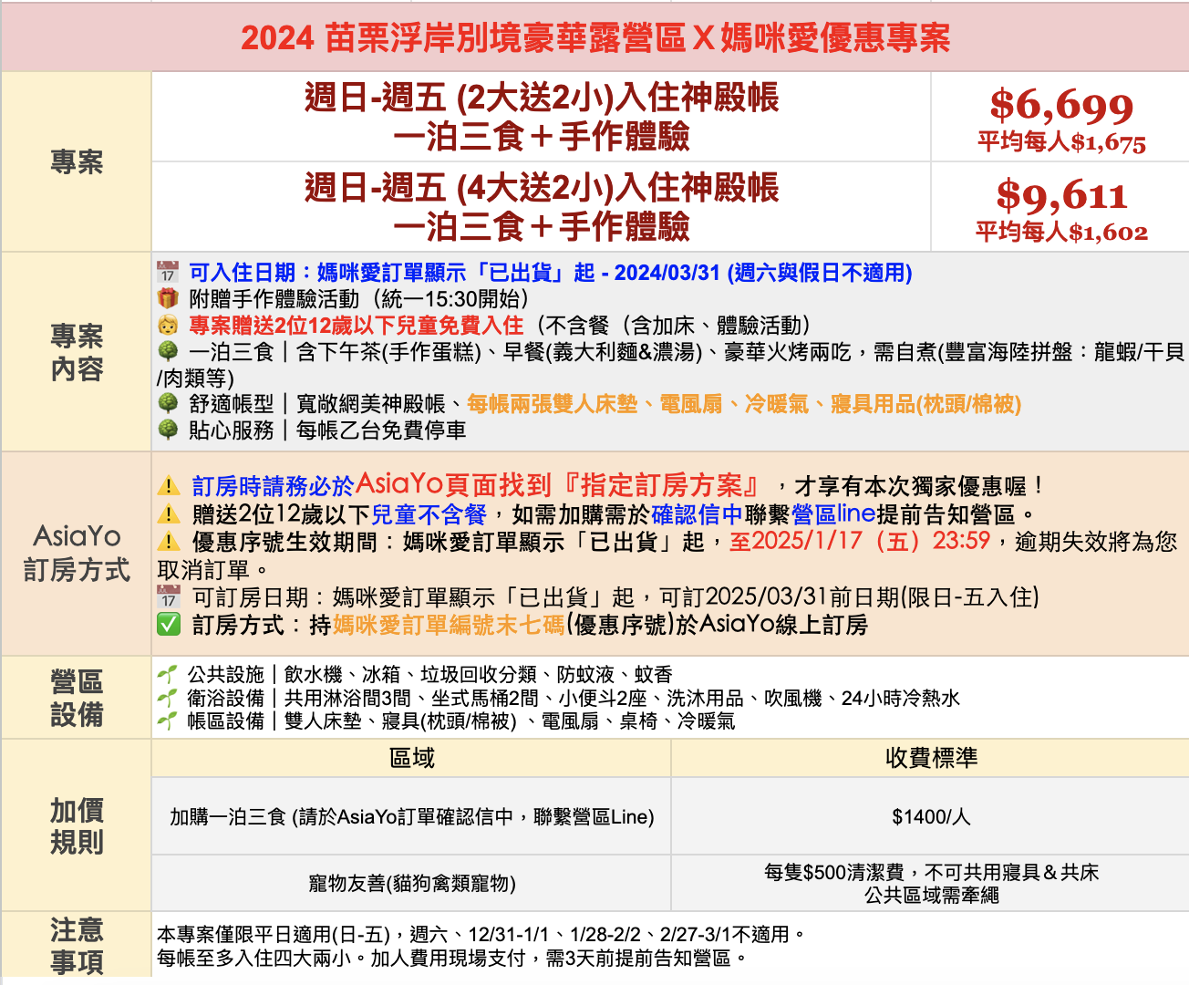 貼心小叮嚀:若贈送的兒童需加購三食,收費為每人$1400。需自行於AsiaYo訂單確認信中,聯繫營區line、並提前告知營區。