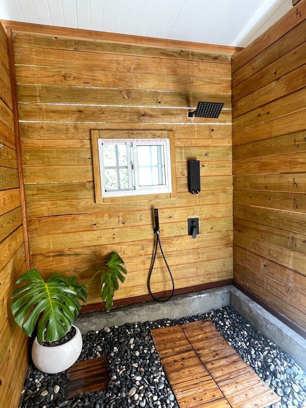 【 苗栗。浮岸別境 】的公共衛浴是走原木路線,非常有質感又有戶外的氛圍呢!