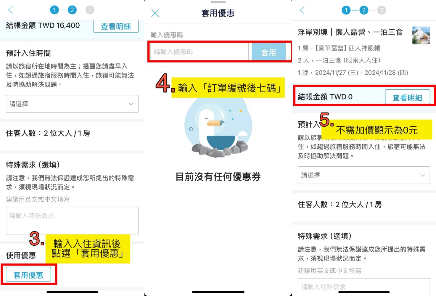 ※ 步驟4 依步驟選擇入住日期及人數 → 於付款前點選「套用優惠」並於輸入優惠碼欄位填寫【 媽咪愛訂單編號後七碼 】→ 點選「套用」即可依本專案優惠結帳並完成訂房。