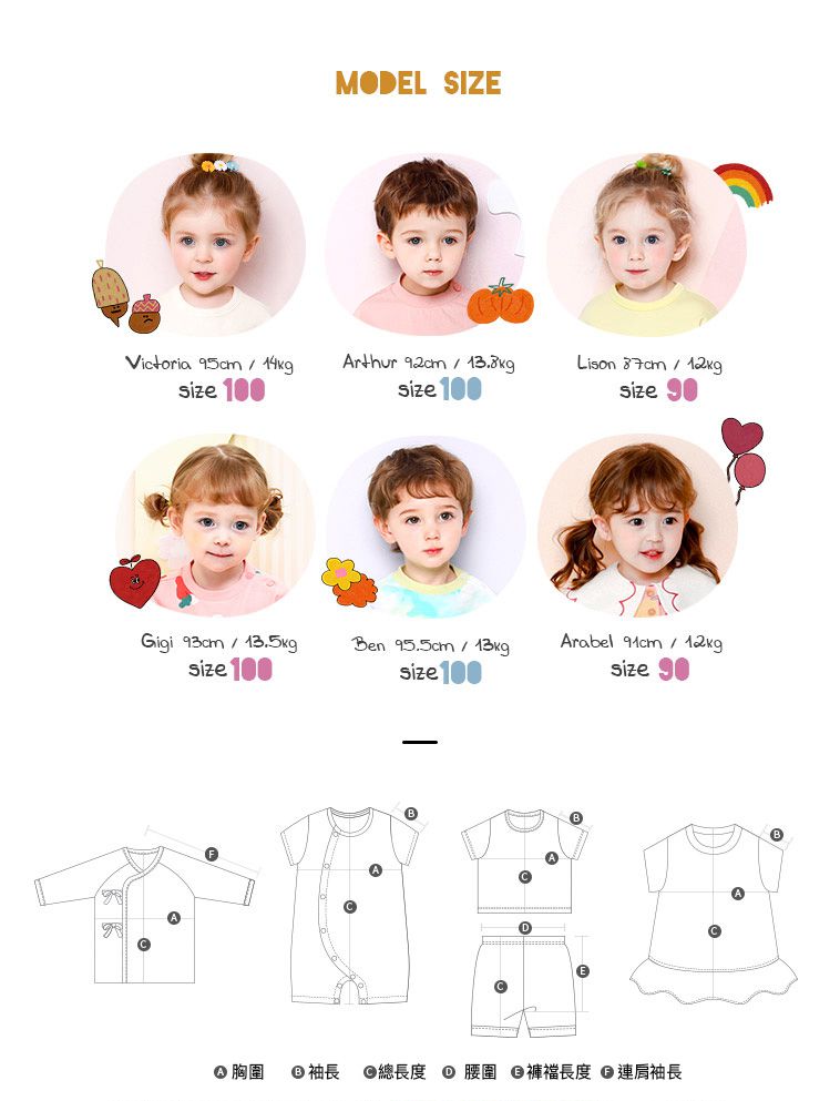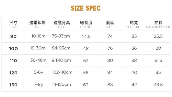 1. 尺寸表單位皆為公分(cm),實際尺寸會因布料彈性、水洗、測量起迄點等因素略有誤差。建議參考孩子平時穿著衣物尺寸進行選購。2. 建議以30度以下冷水,單獨手洗,以免造成移染或掉色。3. 如需機洗,請務必將衣服翻面放入洗衣網、再放洗衣機,以免刮損圖樣。(若有標註不可機洗或乾洗,請勿機洗、乾洗)4. 若含牛仔布、有色布料容易互相染色,請分開或單獨洗滌,以免相互移染。請使用中性洗劑。浸泡時間不宜過長。5. 請勿使用漂白劑、螢光增白劑及衣物柔軟劑,以免破壞布料或導致掉色。6. 洗滌後立刻晾乾,切勿使用烘衣機。過分烘乾可能會破壞織物纖維、導致衣物收縮。7. 如有熨燙需求,請低溫熨燙。8. 每件商品於拍攝時均力求忠實呈現,但因每台電腦、手機或平板等設備之螢幕亮度、解析度不同,可能會有些許色差,謝謝媽咪爸比們的體諒。9. 提醒您,七天猶豫期並非七天試用期呦!商品需保持全新、完整包裝始可申請退換貨,造成不便敬請見諒。10. 預購為海外同步代購,如遇缺貨會儘速通知、協助取消訂單/退款等事宜。