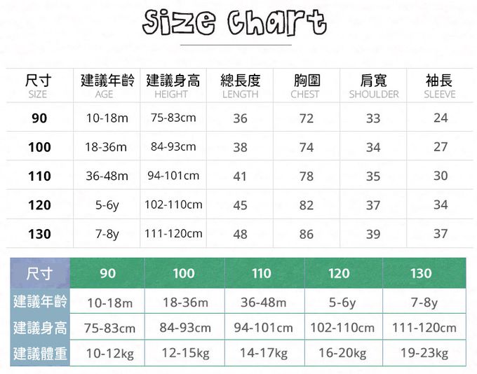 1. 尺寸表單位皆為公分(cm),實際尺寸會因布料彈性、水洗、測量起迄點等因素略有誤差。建議參考孩子平時穿著衣物尺寸進行選購。2. 建議以30度以下冷水,單獨手洗,以免造成移染或掉色。3. 如需機洗,請務必將衣服翻面放入洗衣網、再放洗衣機,以免刮損圖樣。(若有標註不可機洗或乾洗,請勿機洗、乾洗)4. 若含牛仔布、有色布料容易互相染色,請分開或單獨洗滌,以免相互移染。請使用中性洗劑。浸泡時間不宜過長。5. 請勿使用漂白劑、螢光增白劑及衣物柔軟劑,以免破壞布料或導致掉色。6. 洗滌後立刻晾乾,切勿使用烘衣機。過分烘乾可能會破壞織物纖維、導致衣物收縮。7. 如有熨燙需求,請低溫熨燙。8. 每件商品於拍攝時均力求忠實呈現,但因每台電腦、手機或平板等設備之螢幕亮度、解析度不同,可能會有些許色差,謝謝媽咪爸比們的體諒。9. 提醒您,七天猶豫期並非七天試用期呦!商品需保持全新、完整包裝始可申請退換貨,造成不便敬請見諒。10. 預購為海外同步代購,如遇缺貨會儘速通知、協助取消訂單/退款等事宜。