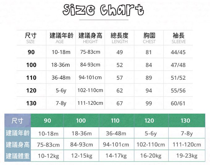 1. 尺寸表單位皆為公分(cm),實際尺寸會因布料彈性、水洗、測量起迄點等因素略有誤差。建議參考孩子平時穿著衣物尺寸進行選購。2. 建議以30度以下冷水,單獨手洗,以免造成移染或掉色。3. 如需機洗,請務必將衣服翻面放入洗衣網、再放洗衣機,以免刮損圖樣。(若有標註不可機洗或乾洗,請勿機洗、乾洗)4. 若含牛仔布、有色布料容易互相染色,請分開或單獨洗滌,以免相互移染。請使用中性洗劑。浸泡時間不宜過長。5. 請勿使用漂白劑、螢光增白劑及衣物柔軟劑,以免破壞布料或導致掉色。6. 洗滌後立刻晾乾,切勿使用烘衣機。過分烘乾可能會破壞織物纖維、導致衣物收縮。7. 如有熨燙需求,請低溫熨燙。8. 每件商品於拍攝時均力求忠實呈現,但因每台電腦、手機或平板等設備之螢幕亮度、解析度不同,可能會有些許色差,謝謝媽咪爸比們的體諒。9. 提醒您,七天猶豫期並非七天試用期呦!商品需保持全新、完整包裝始可申請退換貨,造成不便敬請見諒。10. 預購為海外同步代購,如遇缺貨會儘速通知、協助取消訂單/退款等事宜。