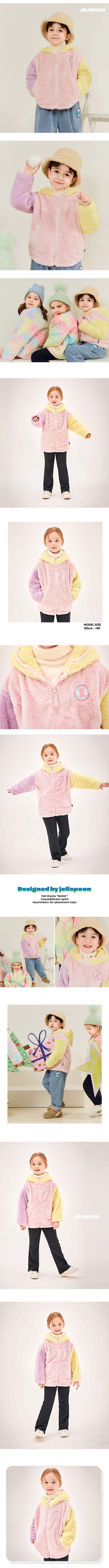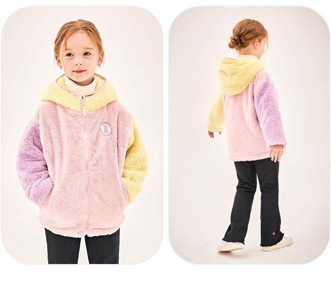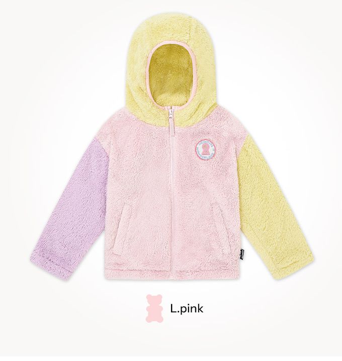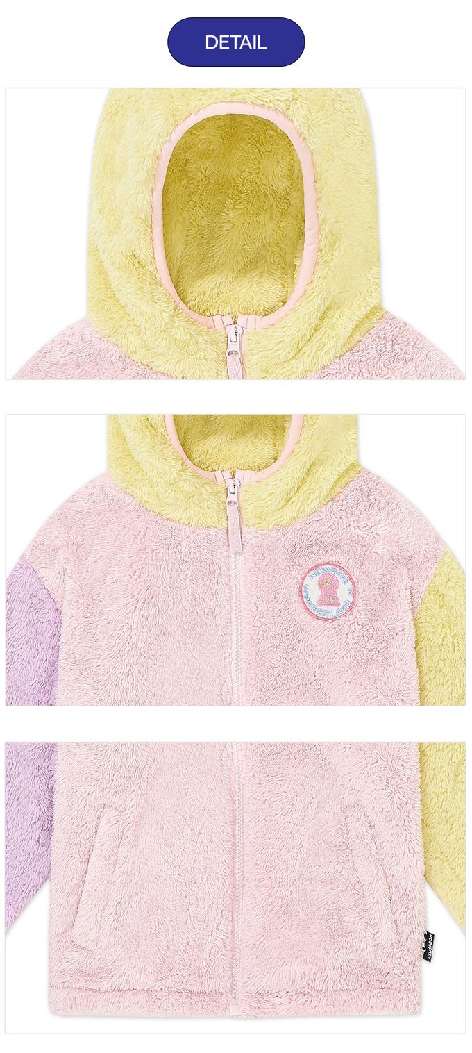 韓國 Jelispoon - 馬卡龍拼色毛絨連帽外套-粉X紫X黃