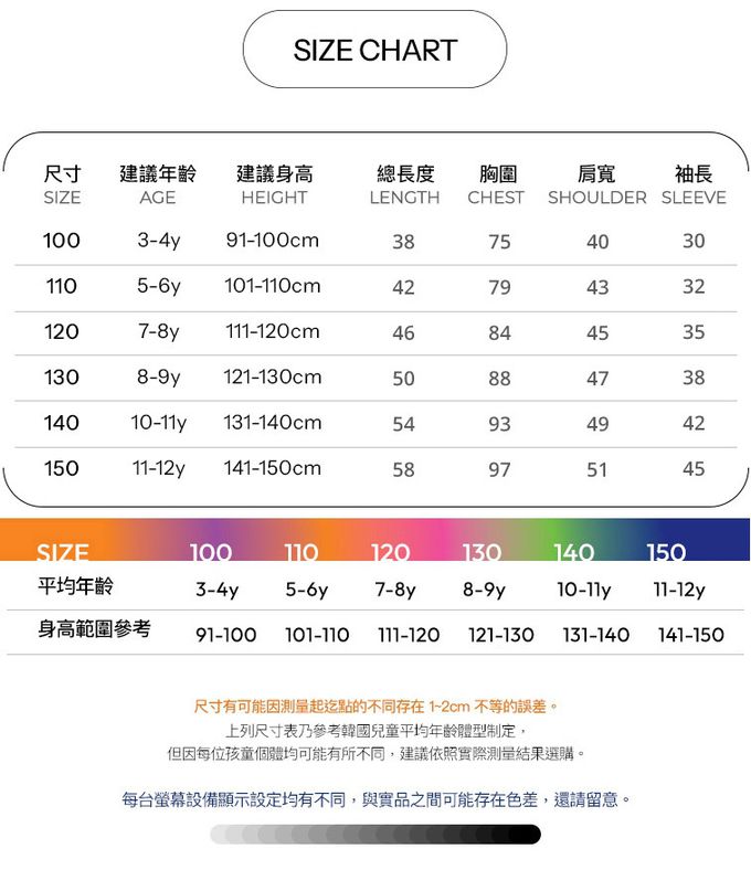1. 尺寸表單位皆為公分(cm),實際尺寸會因布料彈性、水洗、測量起迄點等因素略有誤差。建議參考孩子平時穿著衣物尺寸進行選購。