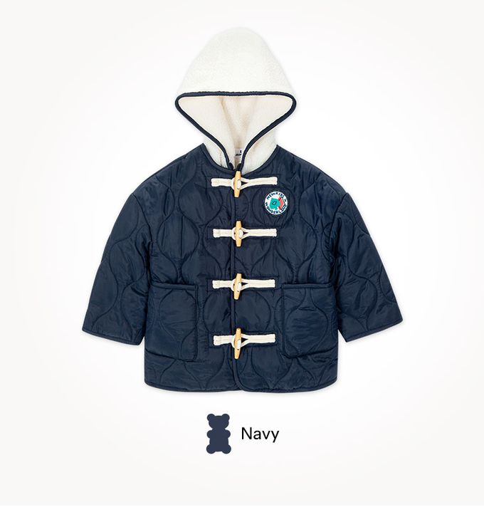 韓國 Jelispoon - 假兩件牛角扣毛料連帽長版外套-海軍藍
