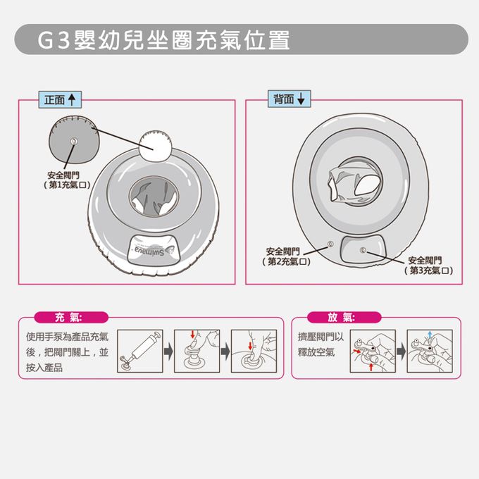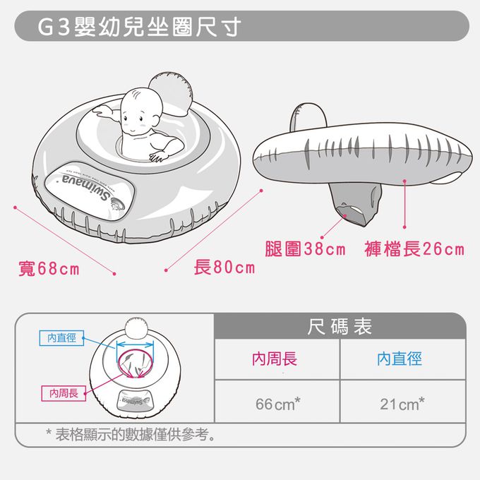 - 建議1歲以上嬰幼兒依個別生長情形選用其他款式游泳圈