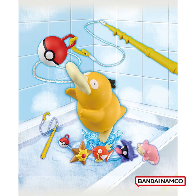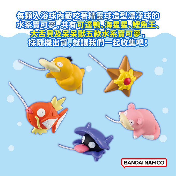 太有趣了! 竟然在浴缸裡可以釣到寶可夢!每顆入浴球直徑約 75 mm,內藏著咬著精靈球造型漂浮球的水系寶可夢,當泡澡球溶化後,就可用附屬的110 mm釣竿,將漂浮在水面上的精靈球釣起,就可以捕捉到寶可夢了!共有可達鴨、海星星、鯉魚王、大舌貝及呆呆獸等五款水系寶可夢,高度約38mm,採隨機出貨,就讓我們一起收集吧!