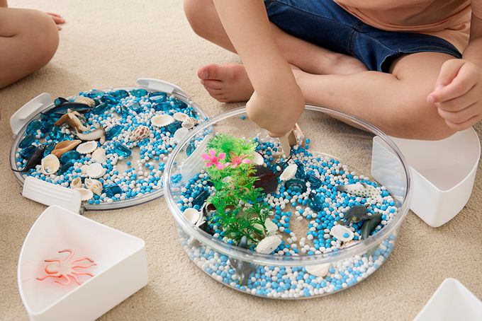 - 新手友善的感官盆組合,內附多種海洋生物、貝殼、水草、不同尺寸的石頭及小木鏟,開盆就能立刻玩!