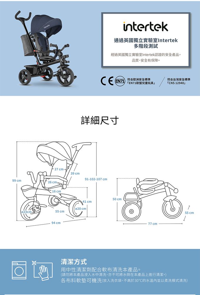 詳細尺寸:展開:W55 x D94 x H99-107cm 收折:W55 x D77 x H50cm