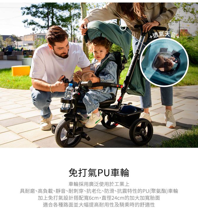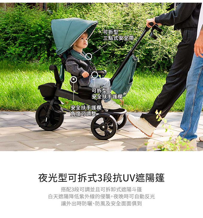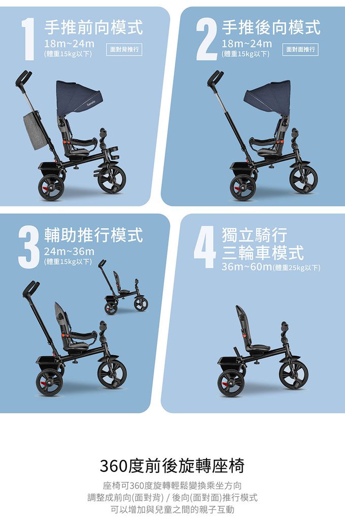 適用年齡:1.5歲-5歲(最大載重25kg) 手推車模式1.5歲-3歲(體重15kg以下) 三輪車模式3歲-5歲(體重25kg以下)