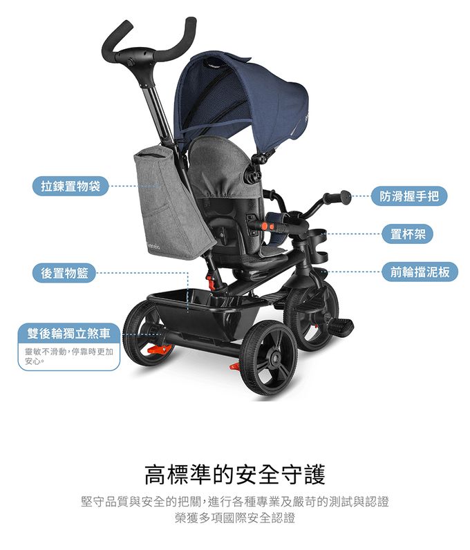 注意事項:若本產品任何部位出現損壞或異常,請立即停止使用並聯絡您所 購買的經銷商或台灣總代理維修中心。 請勿讓兒童站立於本產品上。 使用時,請務必確實繫緊安全帶。 本產品僅供一名兒童使用。 請使用原廠認可的零配件安裝。 絕對不可使用未經原廠認可的配件。 請定期檢查所有三輪車的零配件是否有異常,以確保其正常運作。 請勿在三輪車車架上懸掛或放置任何重物,否則可能會導致三輪 車掉落並傷害兒童。 兒童乘坐或離開本產品時,請鎖定煞車以免車輛滑動。 本產品請遠離火源和熱源。 置物籃最大可乘載重量為1kg 本產品應在遠離公路的平順道路上使用。 較小的兒童請在成人陪同下使用三輪車。 使用三輪車模式自行踩踏時請在兒童具有基礎自力踩踏兒童三輪 車的能力時使用,並隨時留意兒童防止其發生跌倒、碰撞、受傷 或傷害他人的事故發生。 透過停止腳踏板來煞車。