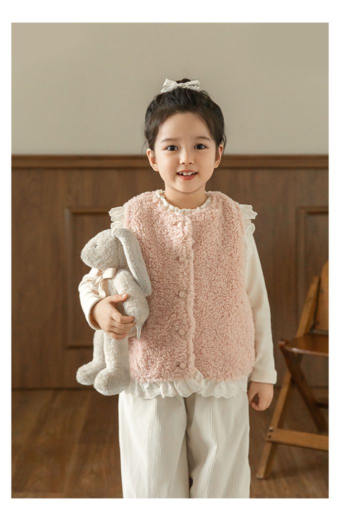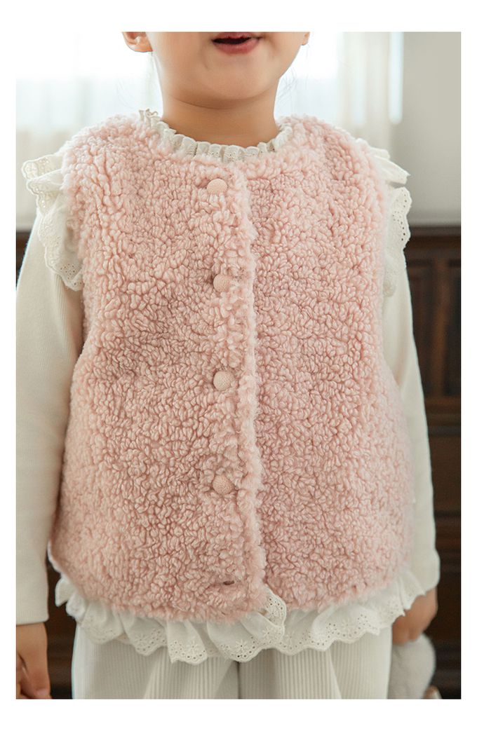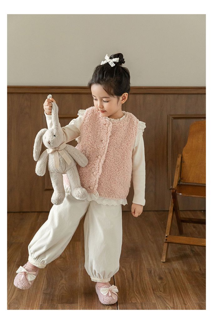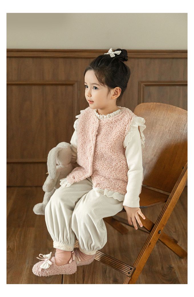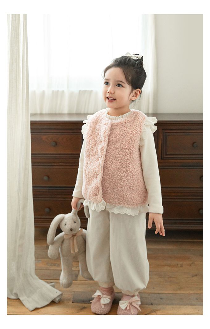 加厚保暖泰迪熊毛毛背心(加絨)-刺繡花邊-粉色