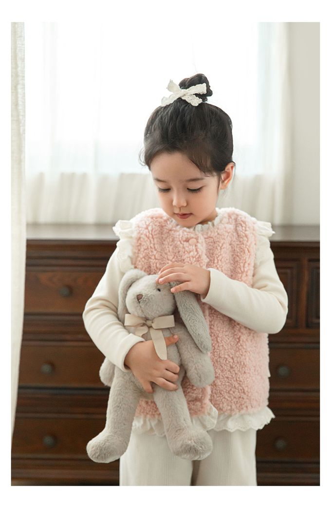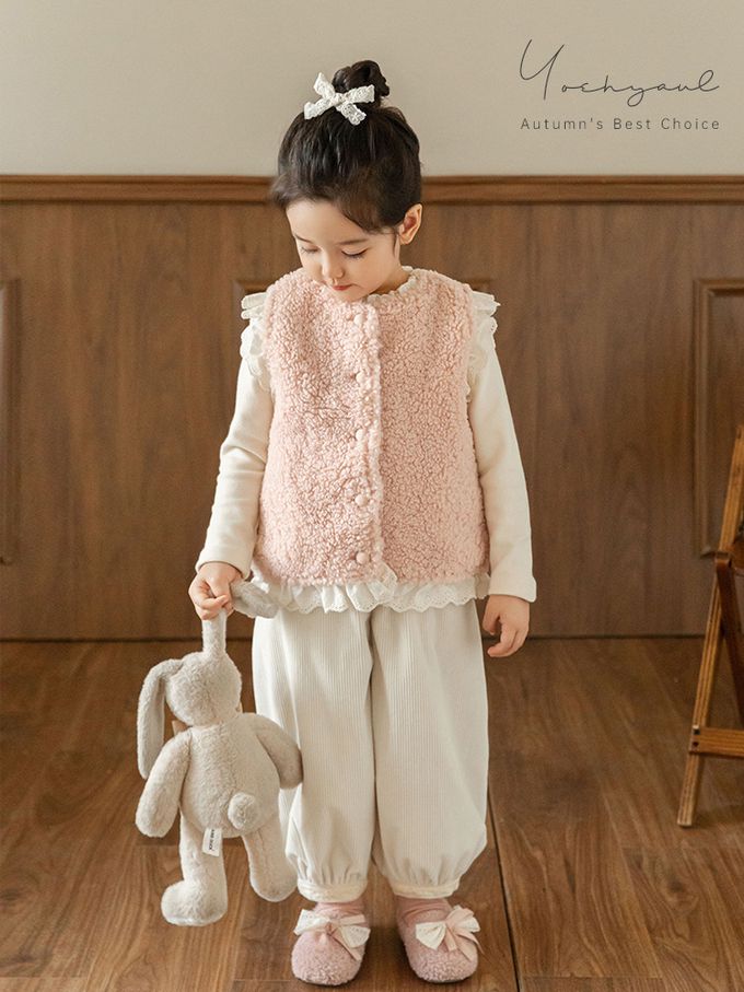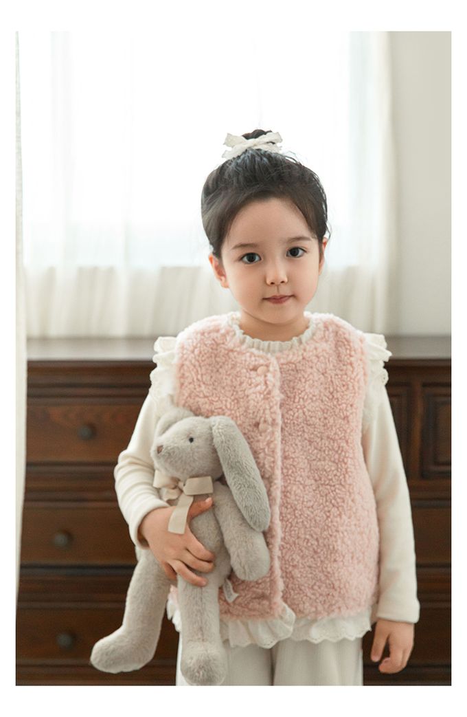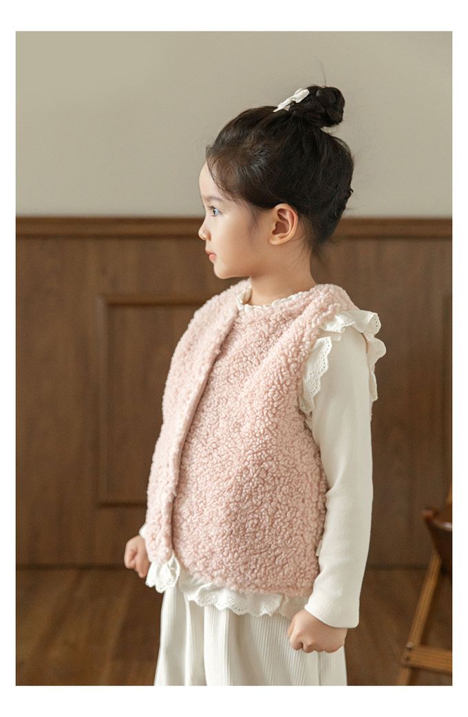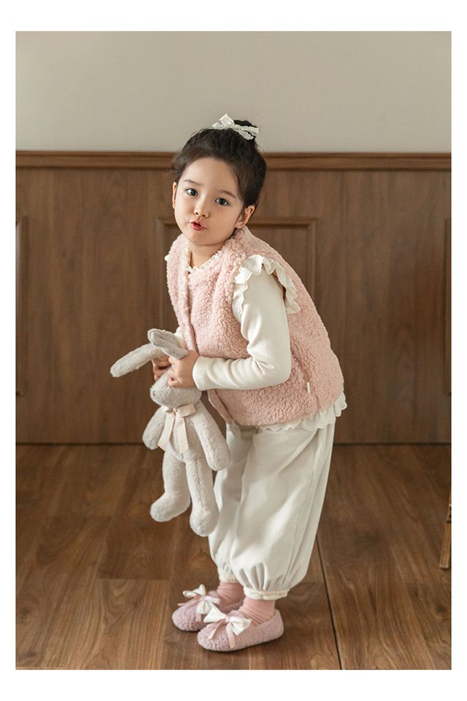 加厚保暖泰迪熊毛毛背心(加絨)-刺繡花邊-粉色
