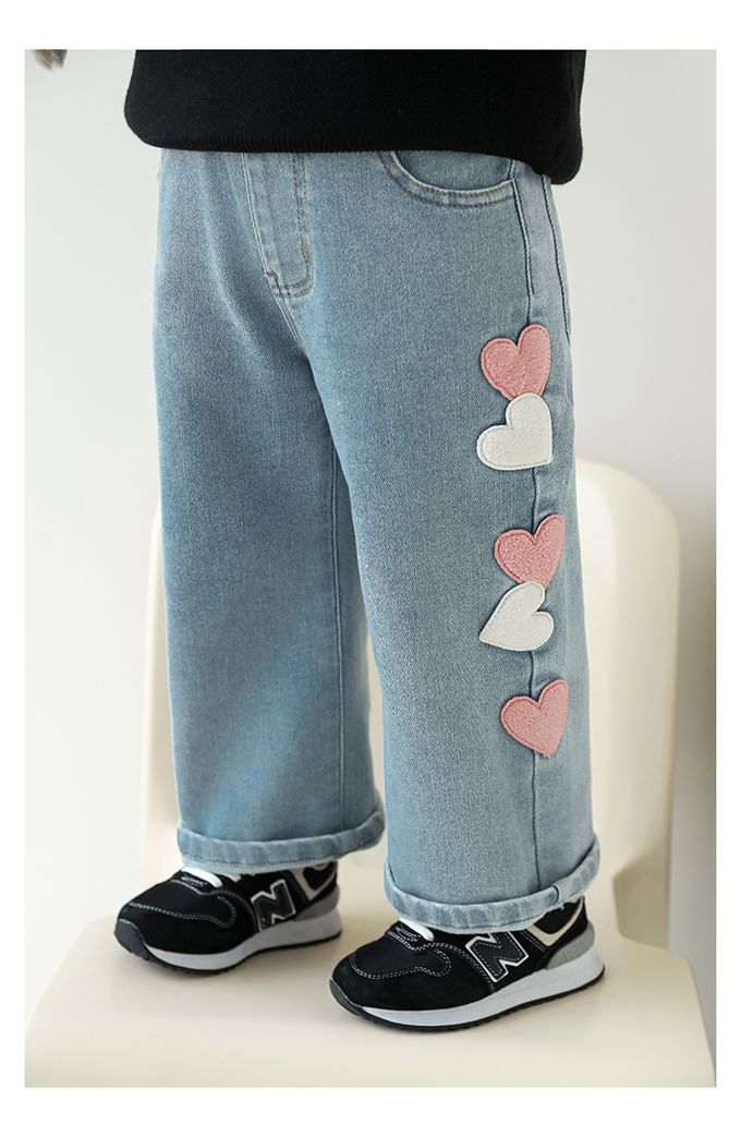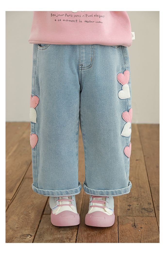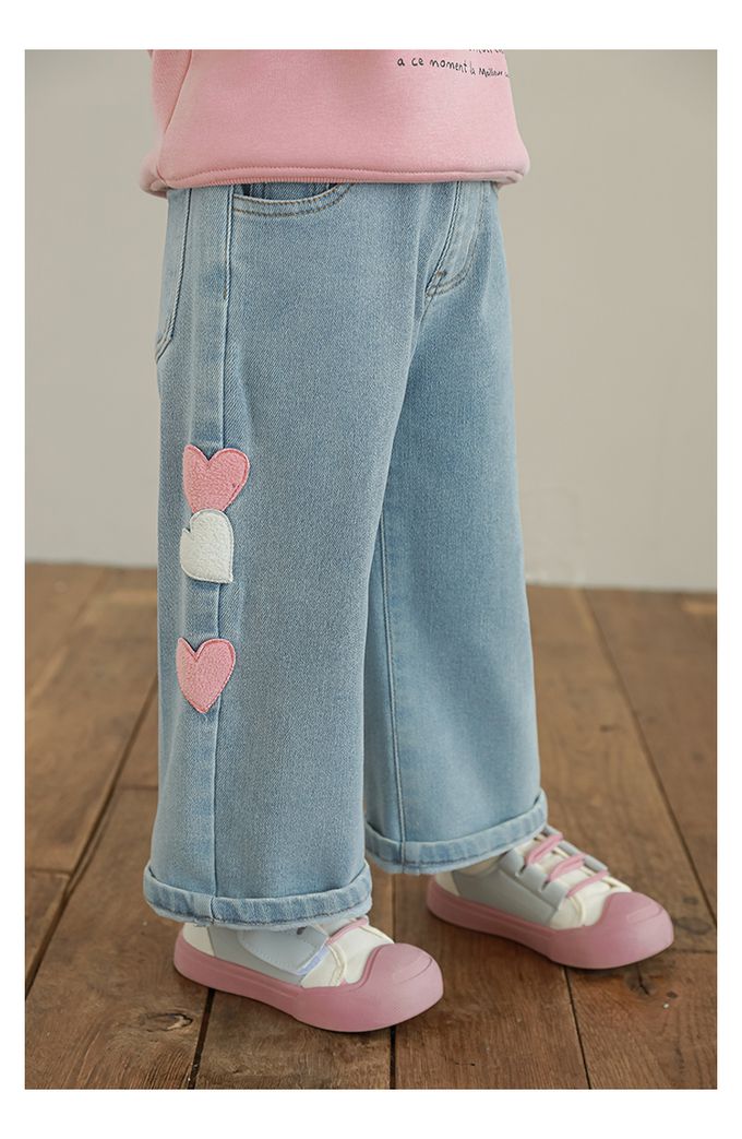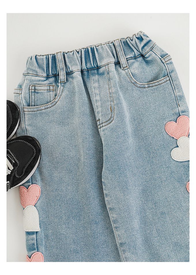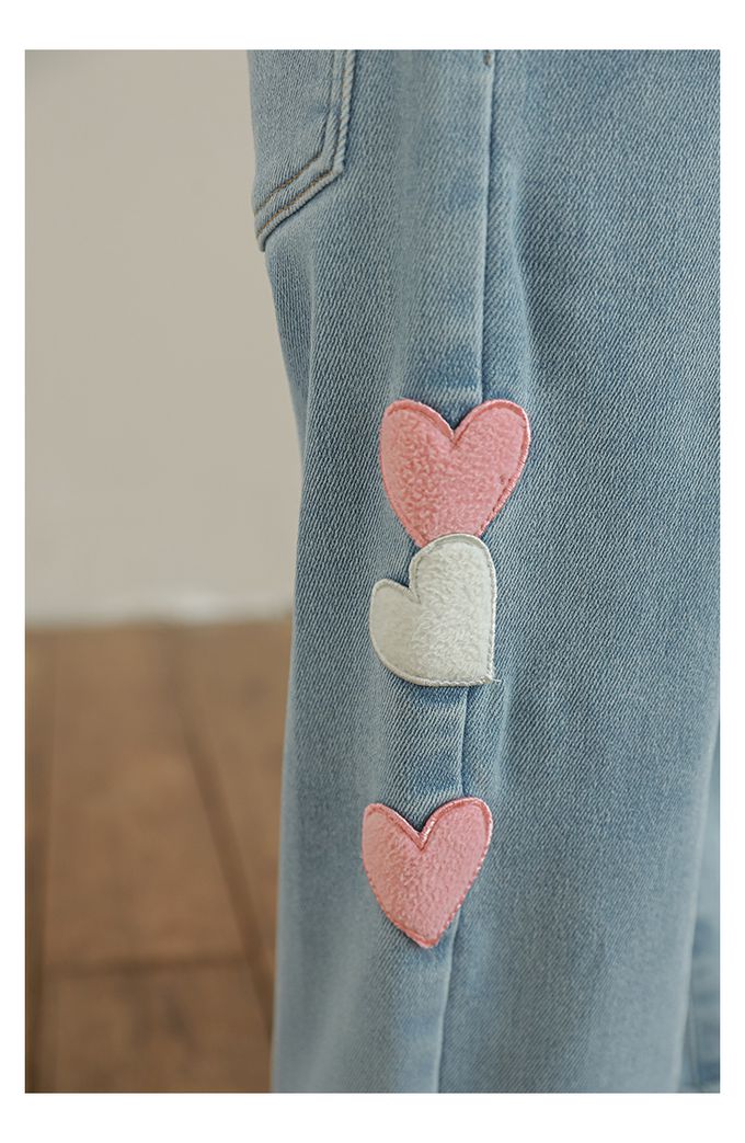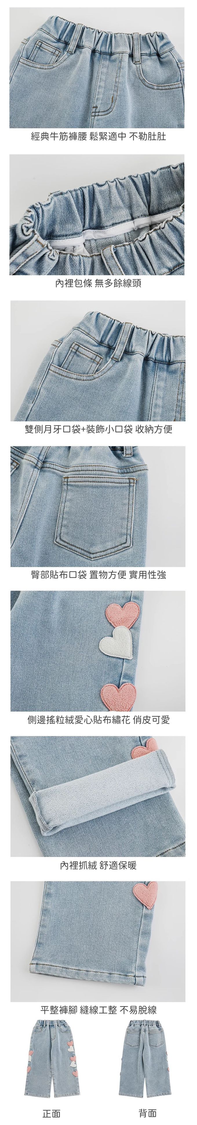 腰鬆緊微刷絨保暖直筒牛仔褲-愛心貼布繡-藍色
