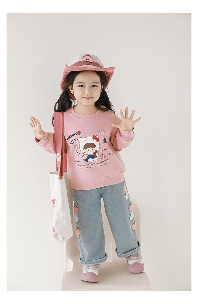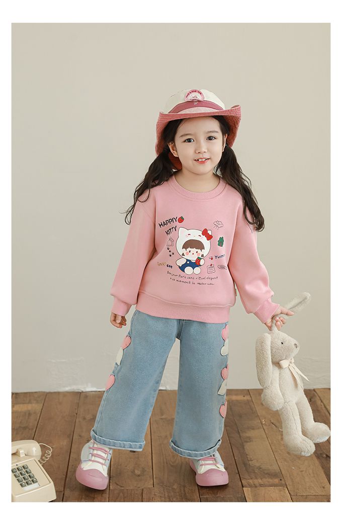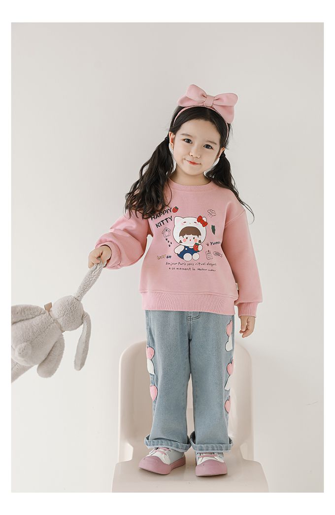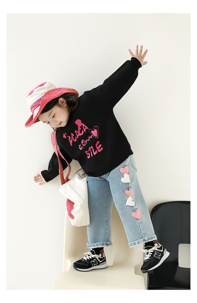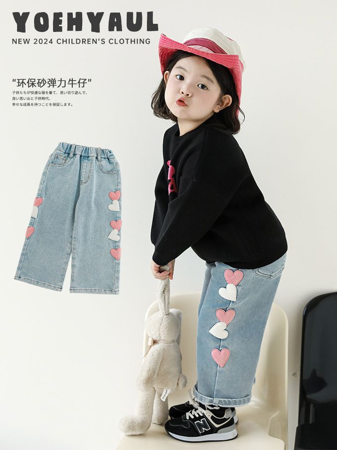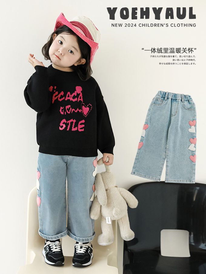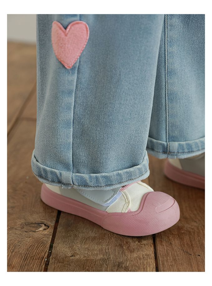 腰鬆緊微刷絨保暖直筒牛仔褲-愛心貼布繡-藍色