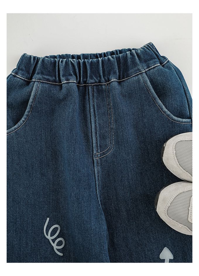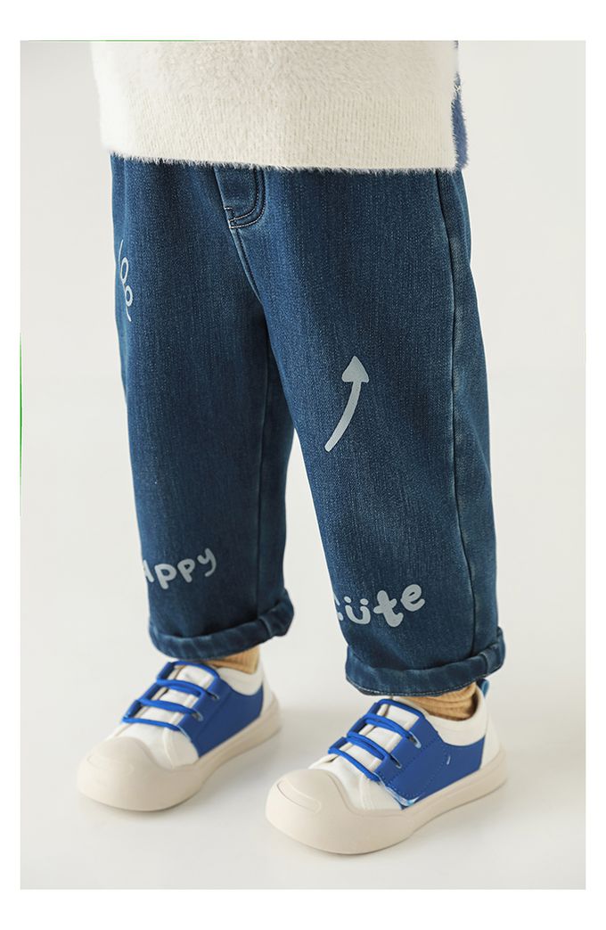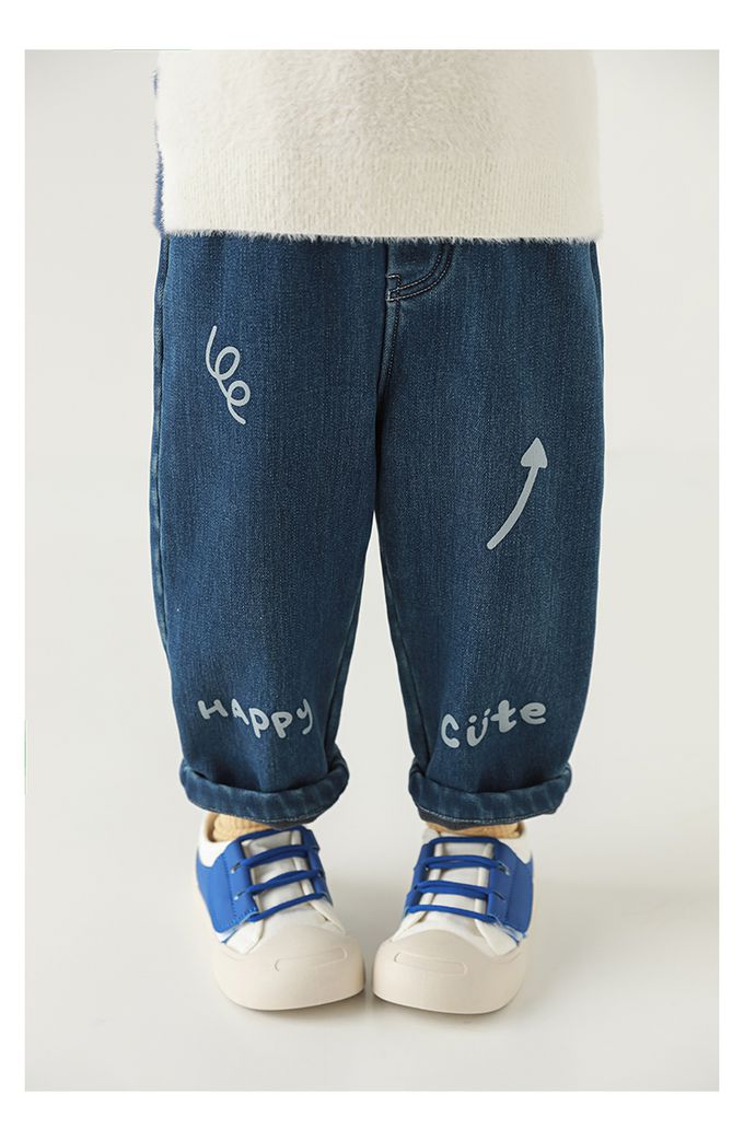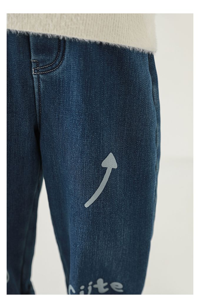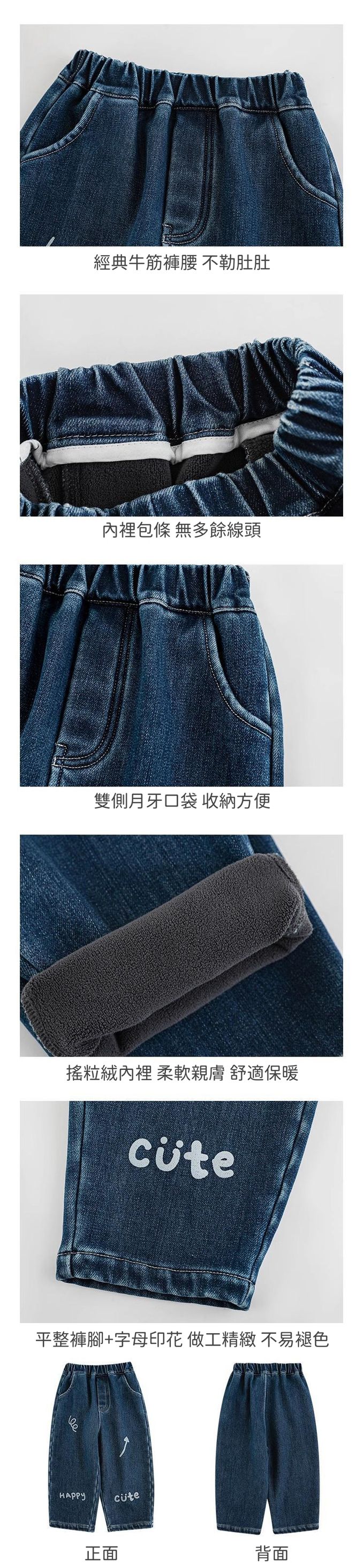 腰鬆緊休閒軟牛仔長褲(加絨)-HAPPY&CUTE-深藍色