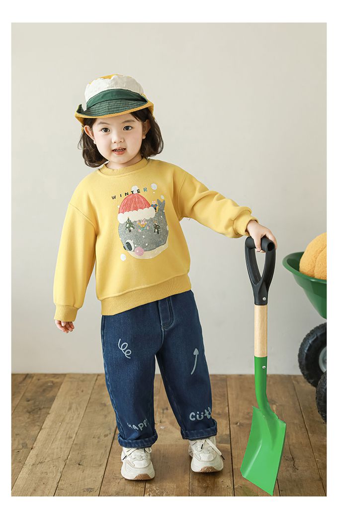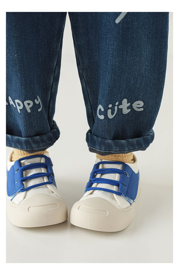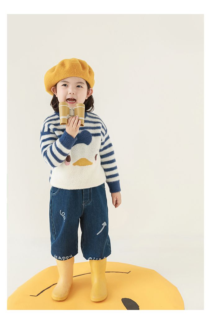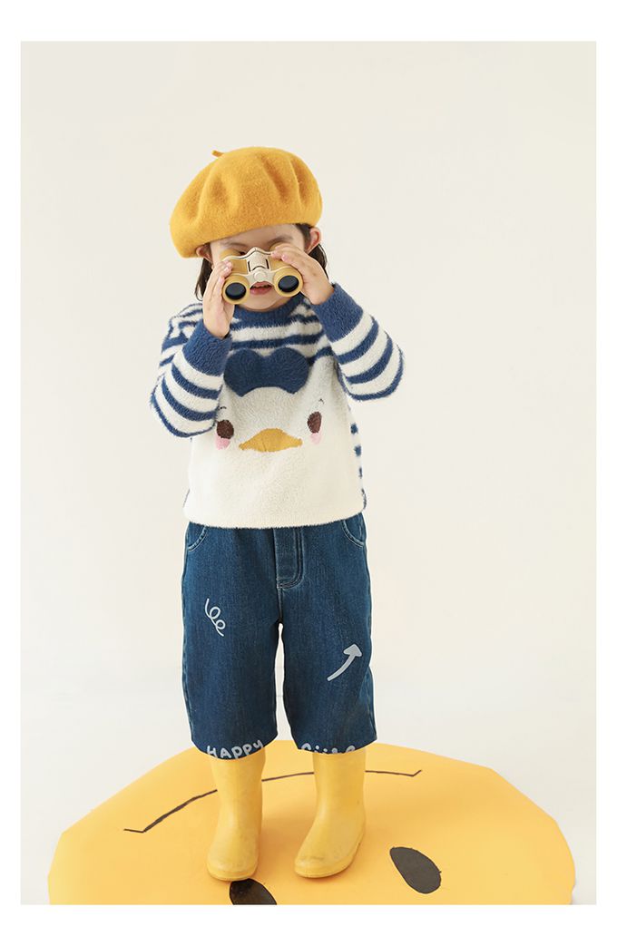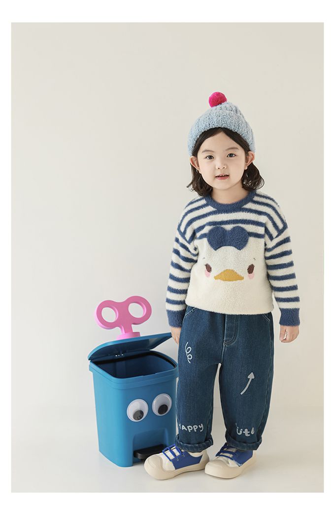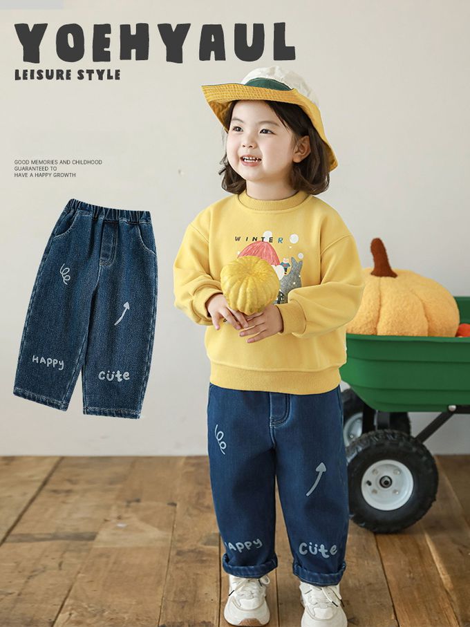 腰鬆緊休閒軟牛仔長褲(加絨)-HAPPY&CUTE-深藍色