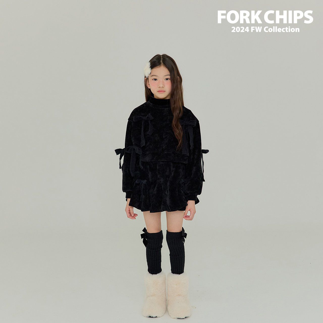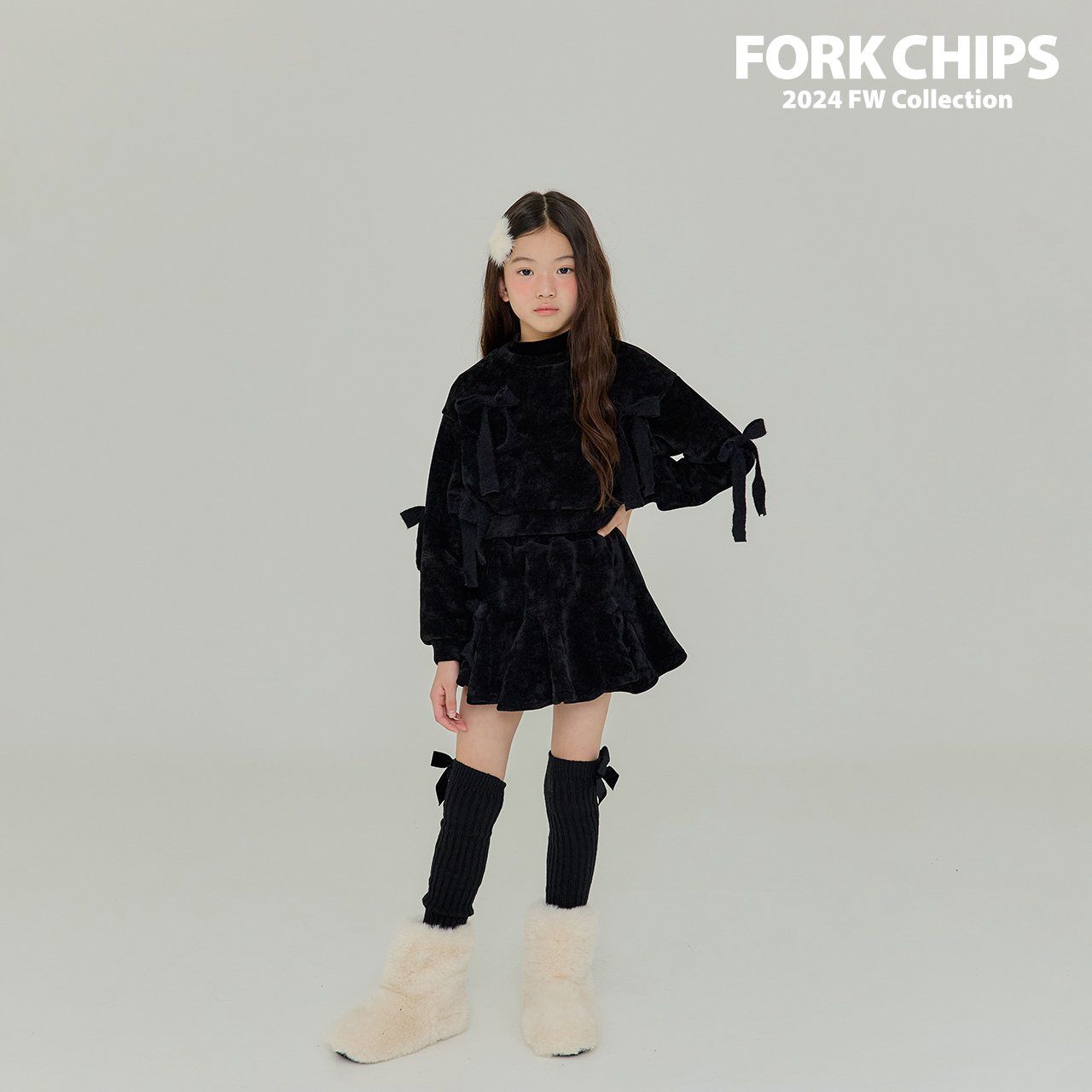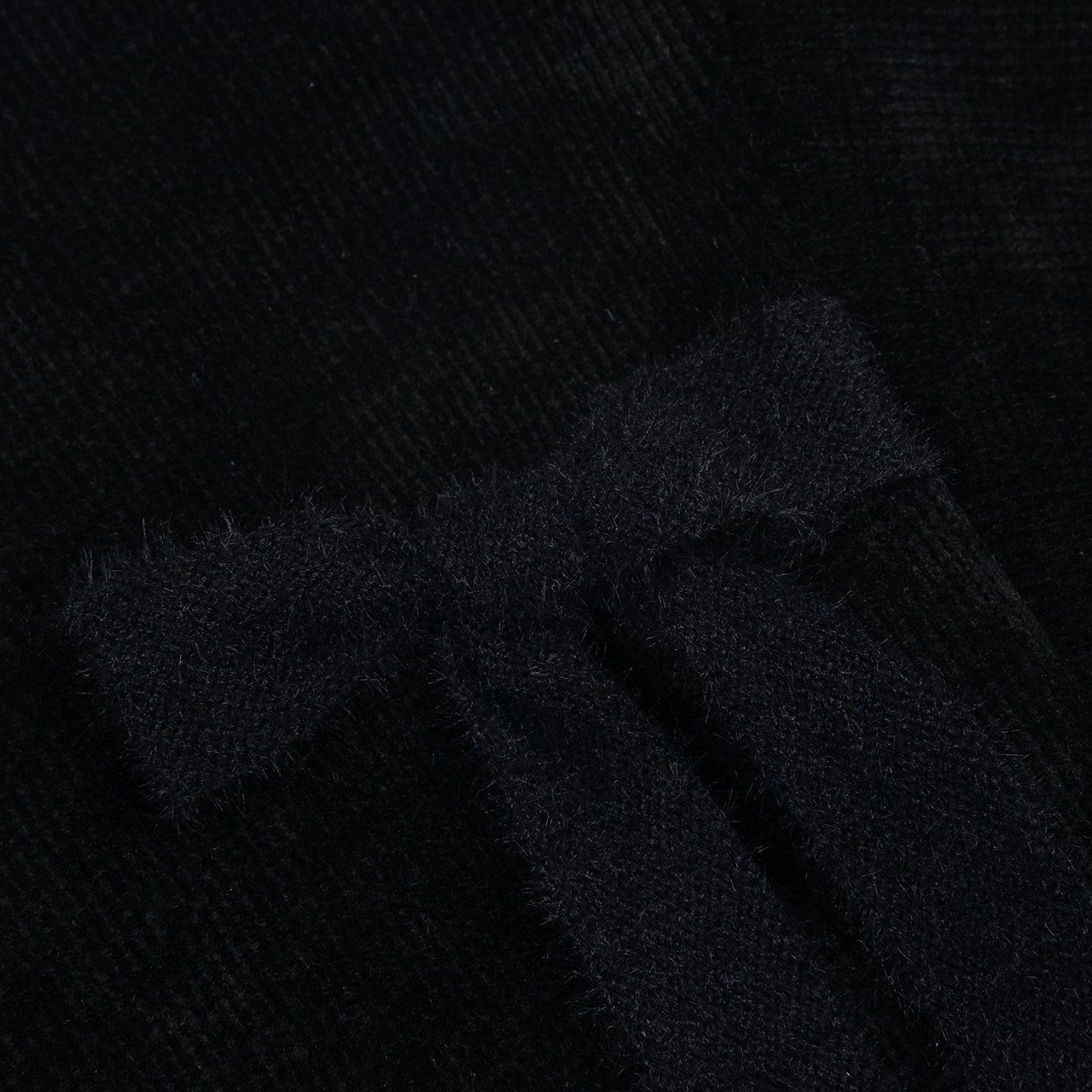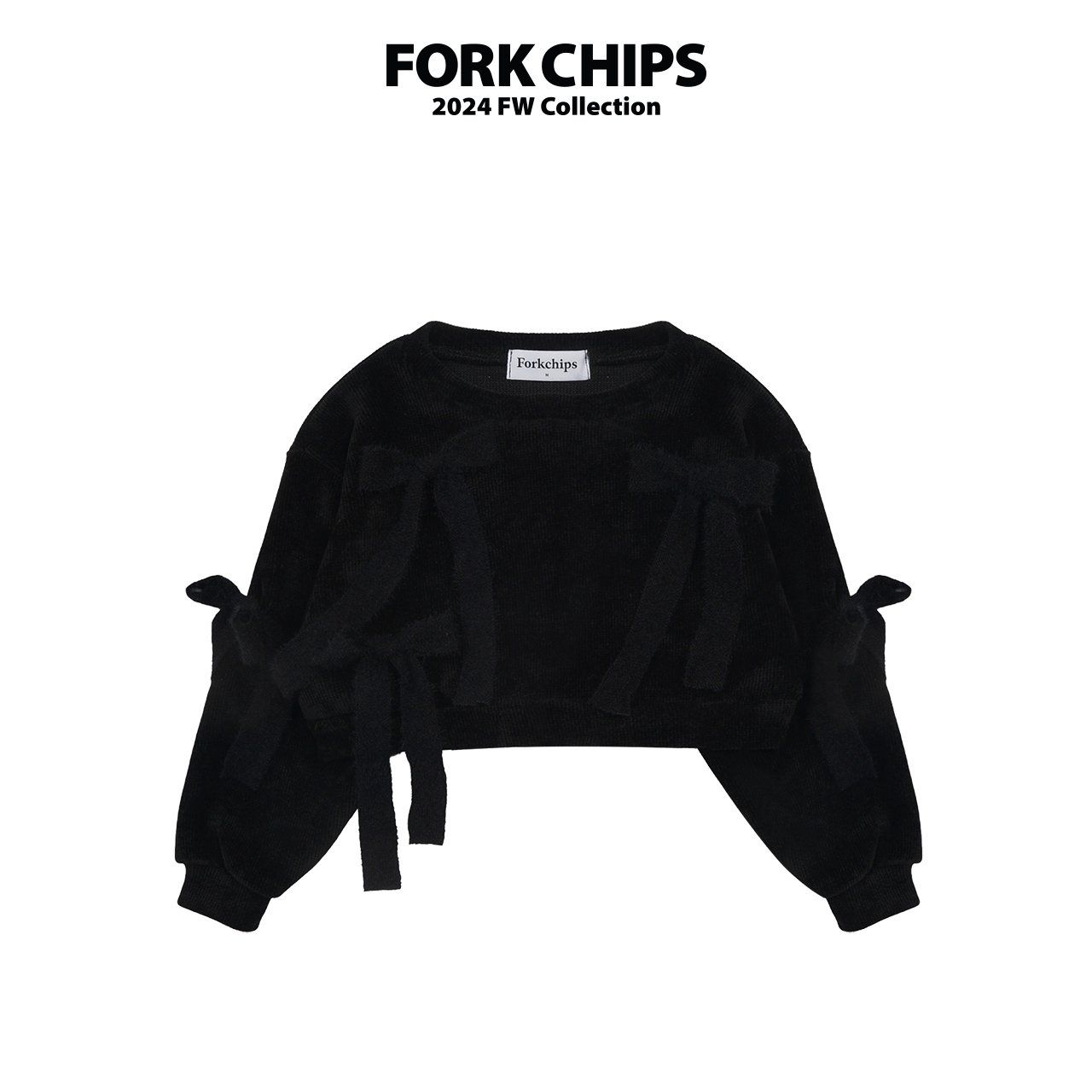 韓國 FORK CHIPS - 蝴蝶結點綴馬海毛針織長袖上衣-黑