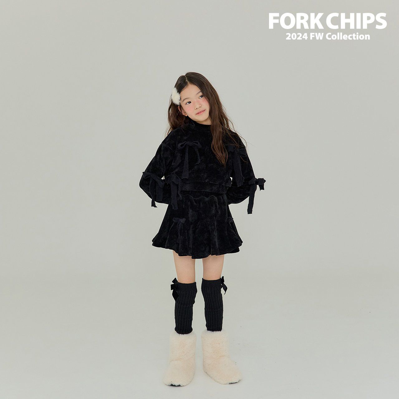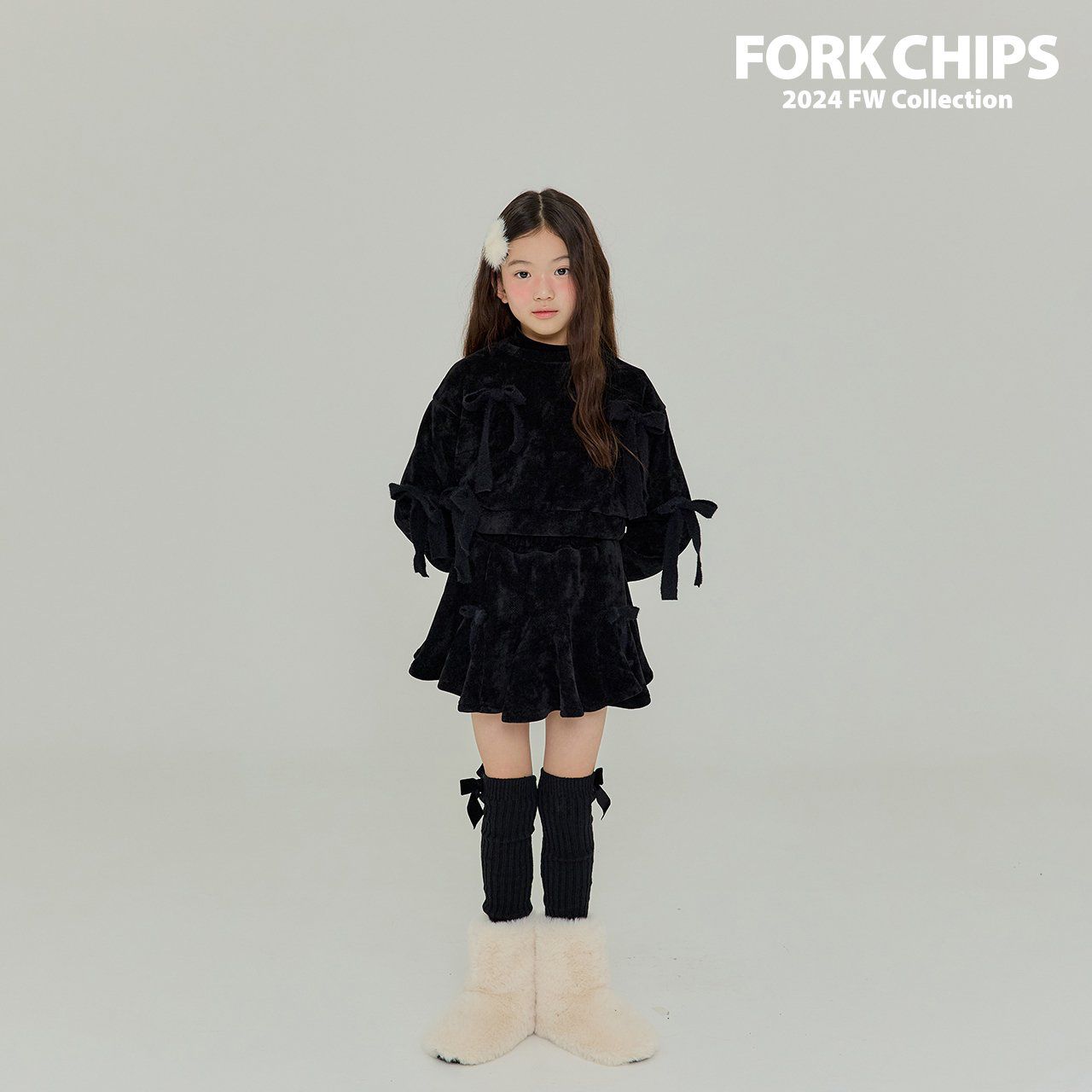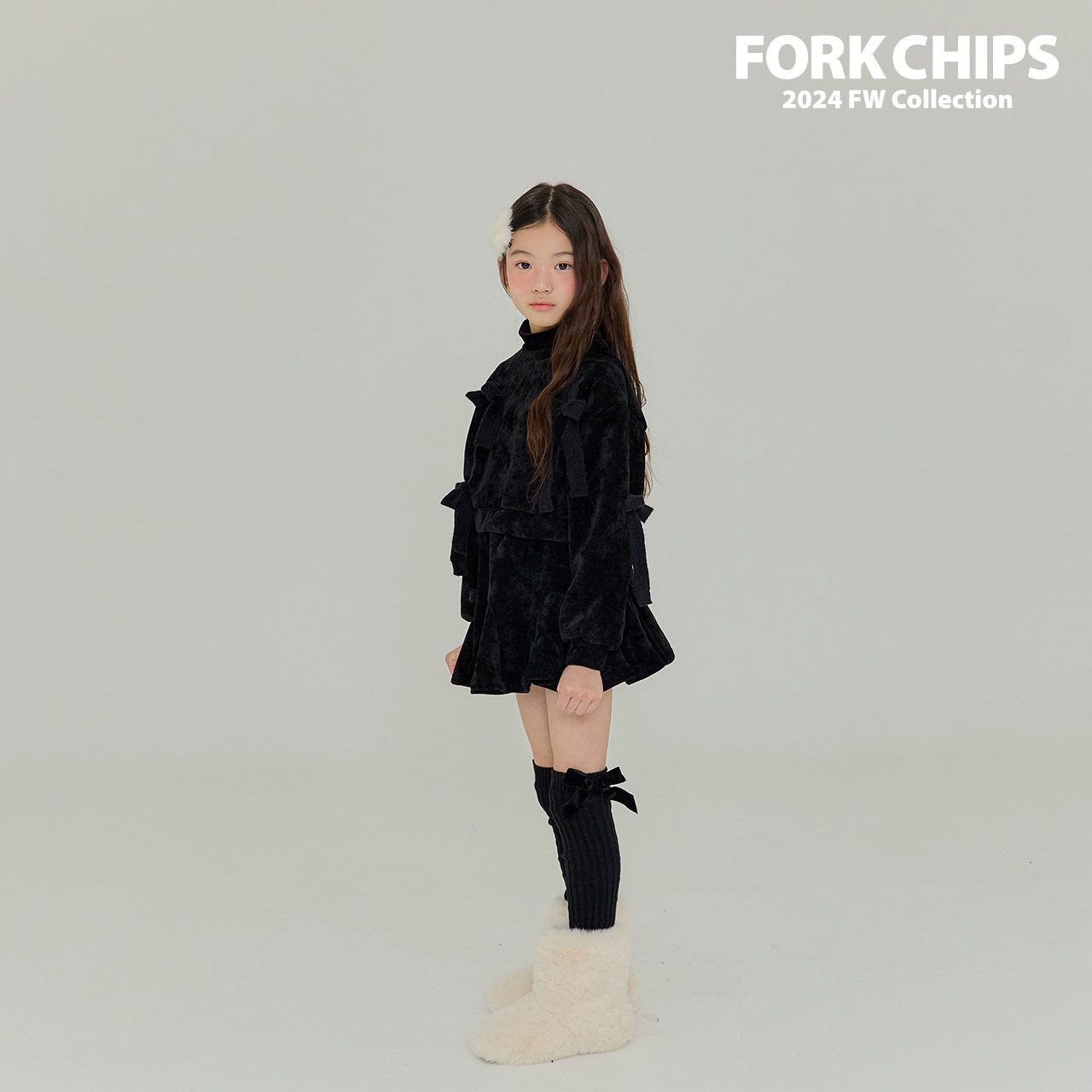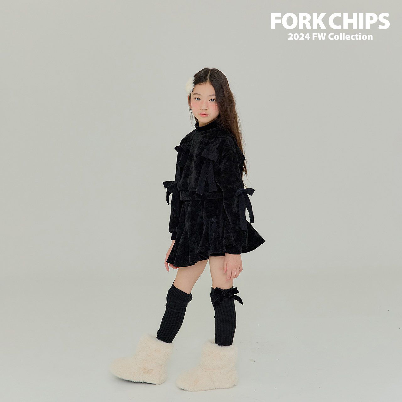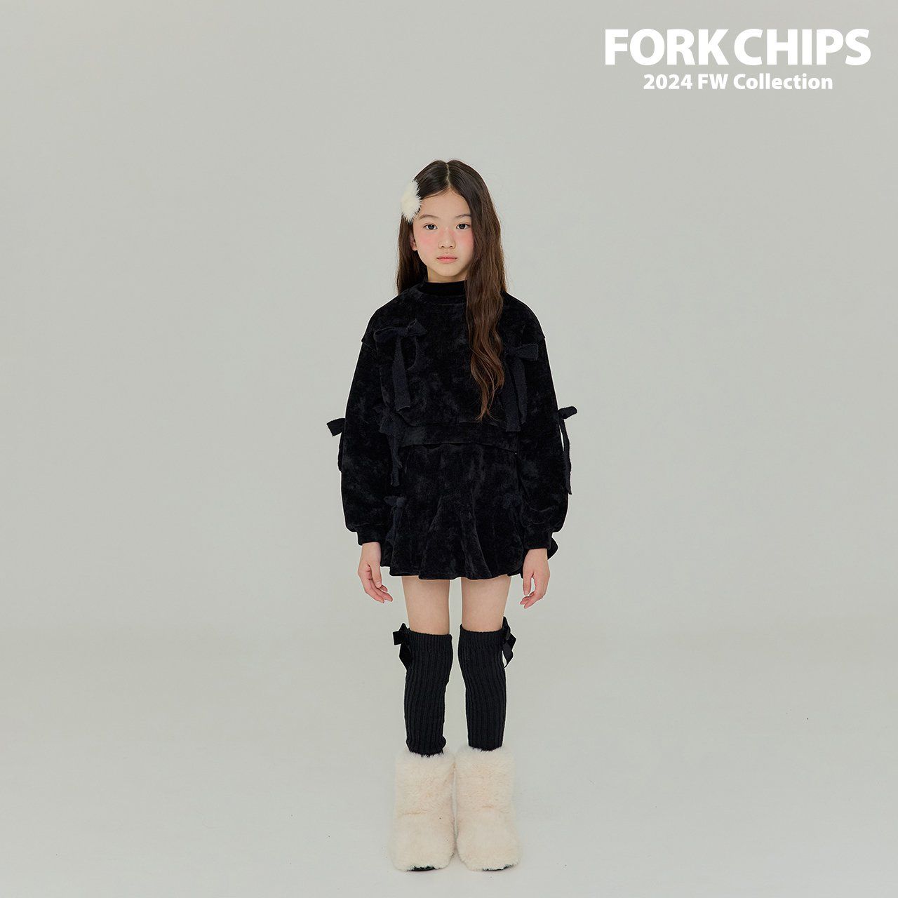 韓國 FORK CHIPS - 蝴蝶結點綴馬海毛針織長袖上衣-黑