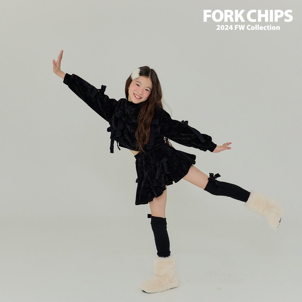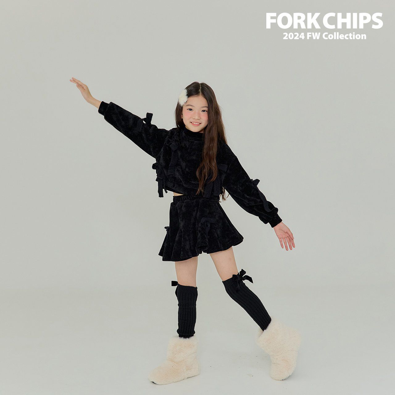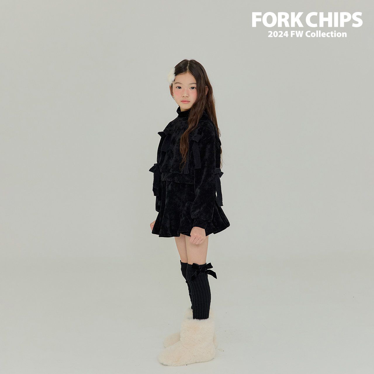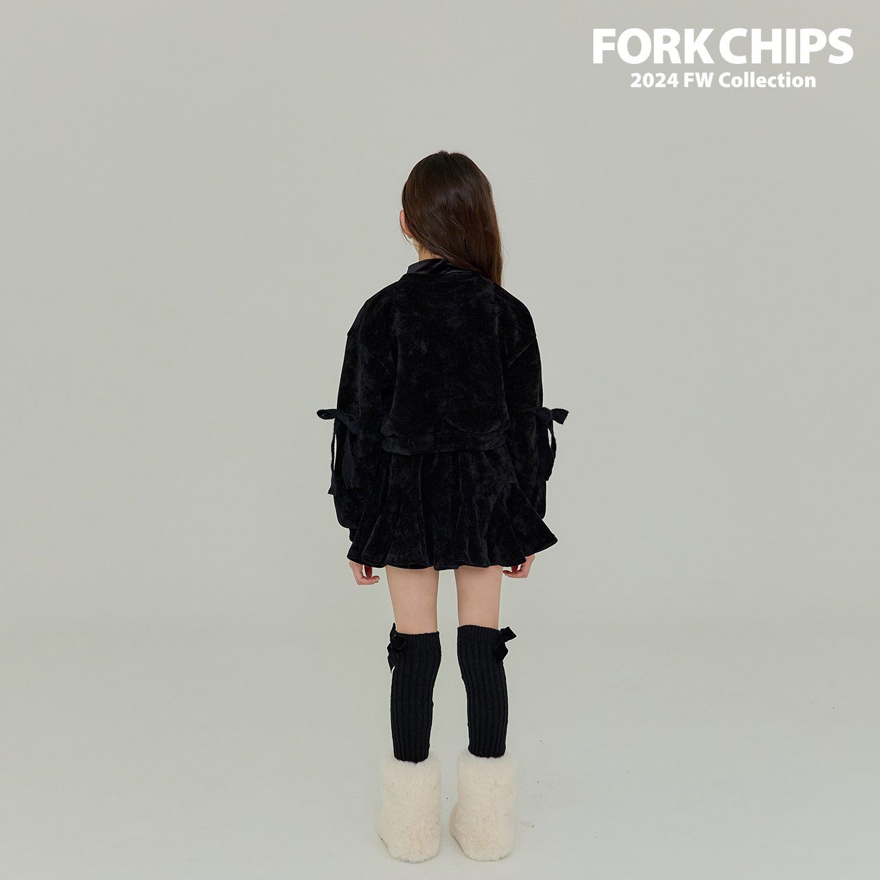 韓國 FORK CHIPS - 蝴蝶結點綴馬海毛針織長袖上衣-黑