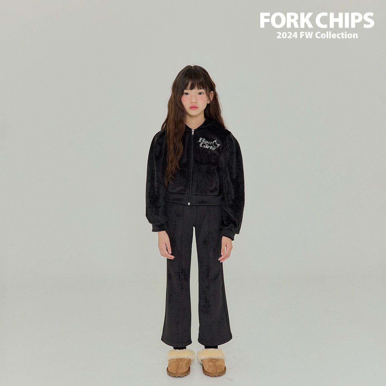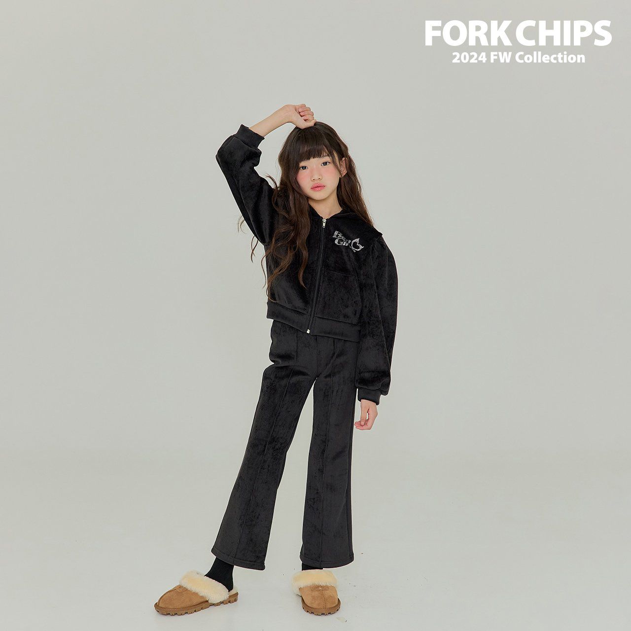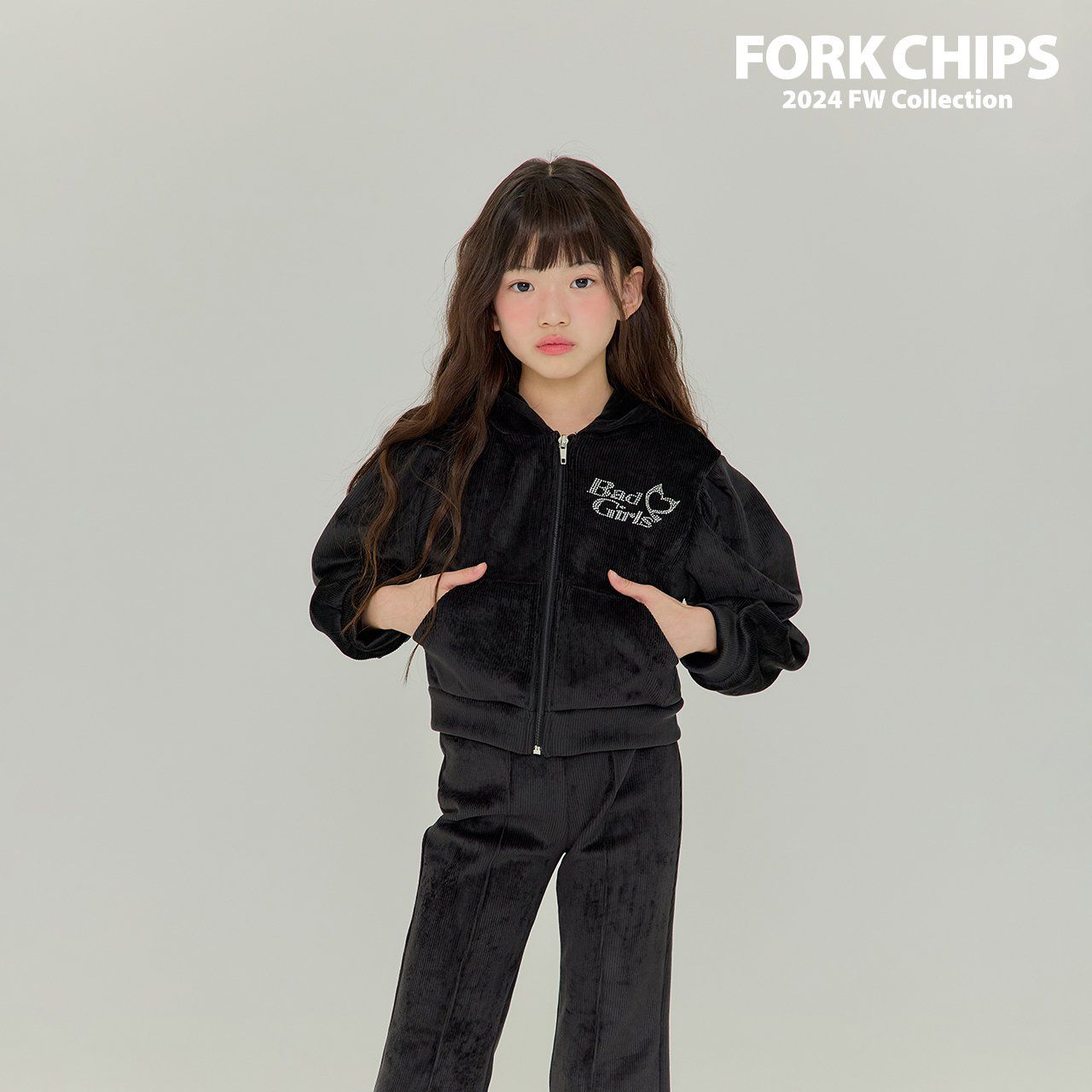 韓國 FORK CHIPS - 燙鑽點綴燈芯絨連帽拉鏈上衣/外套-黑