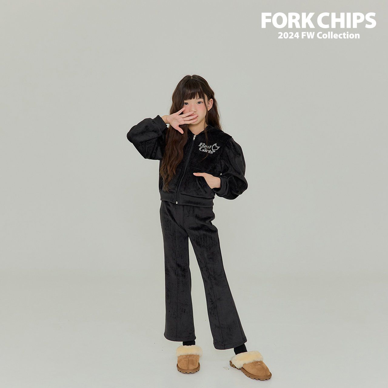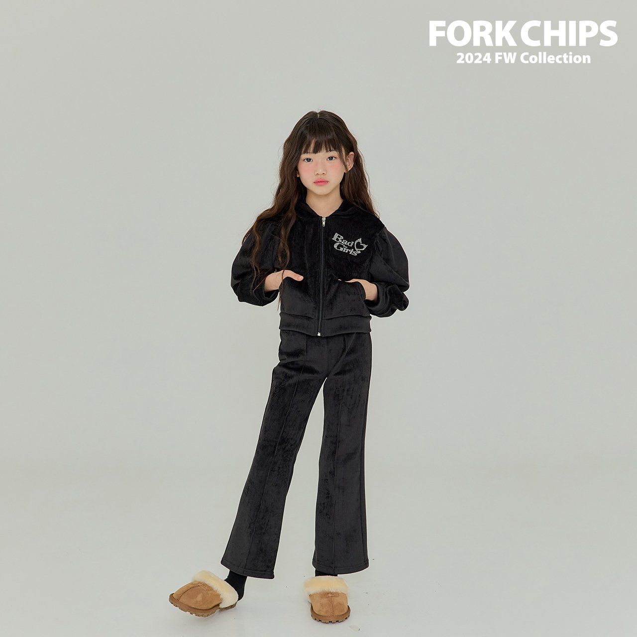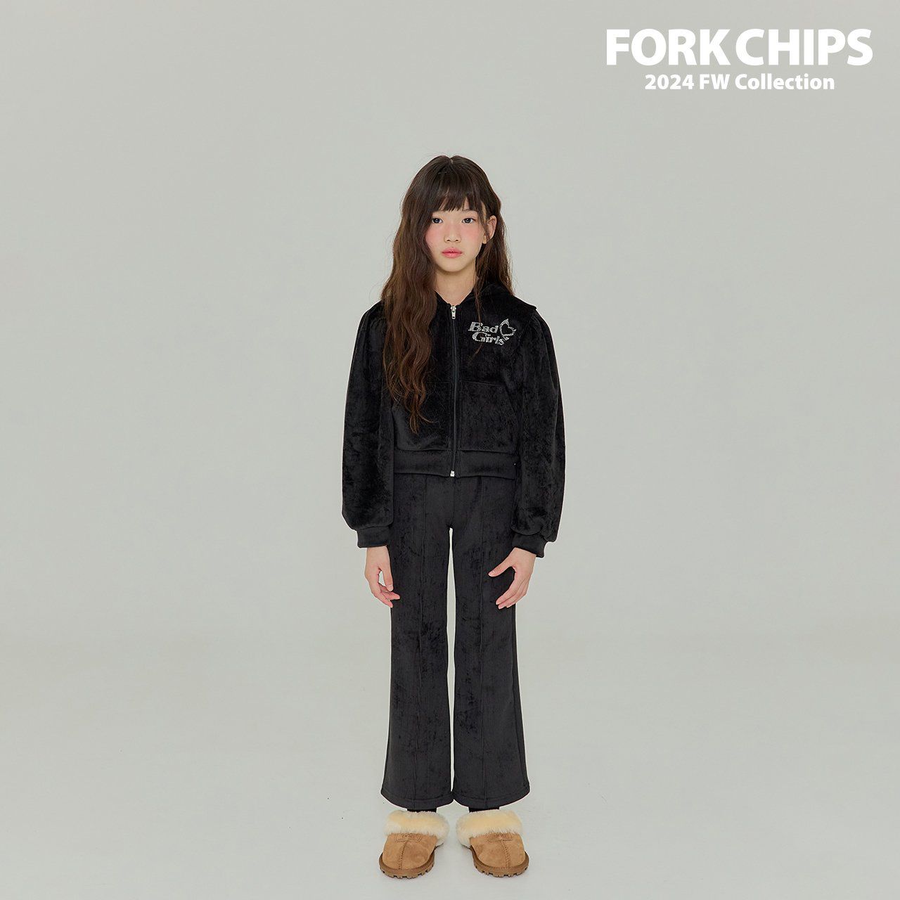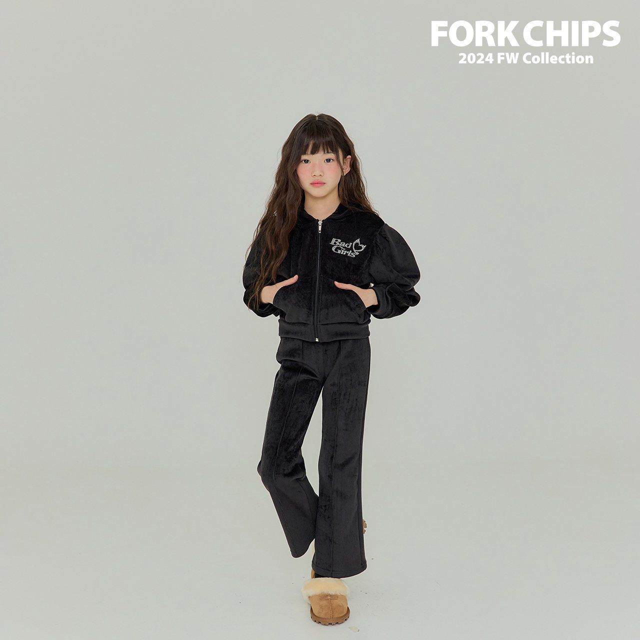 韓國 FORK CHIPS - 燙鑽點綴燈芯絨連帽拉鏈上衣/外套-黑