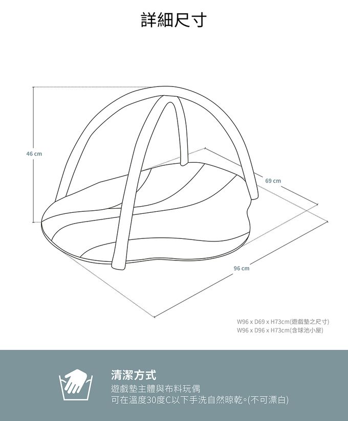 詳細尺寸:W96 x D69 x H46cm(遊戲墊之尺寸) W96 x D96 x H46cm(含球池小屋)
