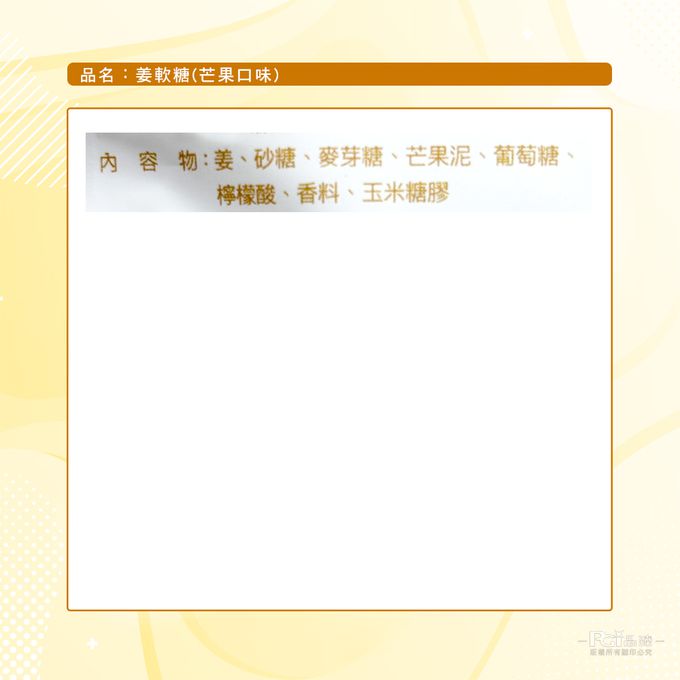 成分:百香果:姜、砂糖、麥芽糖、百香果原汁、葡萄糖、檸檬酸、香料、玉米糖膠 芒果:姜、砂糖、麥芽糖、芒果泥、葡萄、檸檬酸、香料、玉米糖膠 鳳梨:姜、砂糖、麥芽糖、鳳梨濃縮汁、葡萄糖、檸檬原汁、檸檬酸、香料、玉米糖膠 蜂蜜檸檬:姜、砂糖、麥芽糖、蜂蜜、檸檬原汁、金桔原汁、葡萄糖、檸檬酸、香料、玉米糖膠
