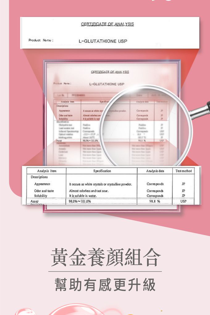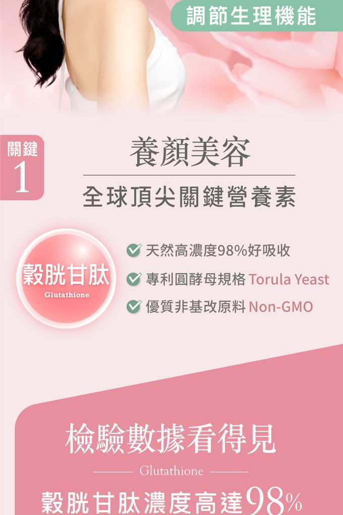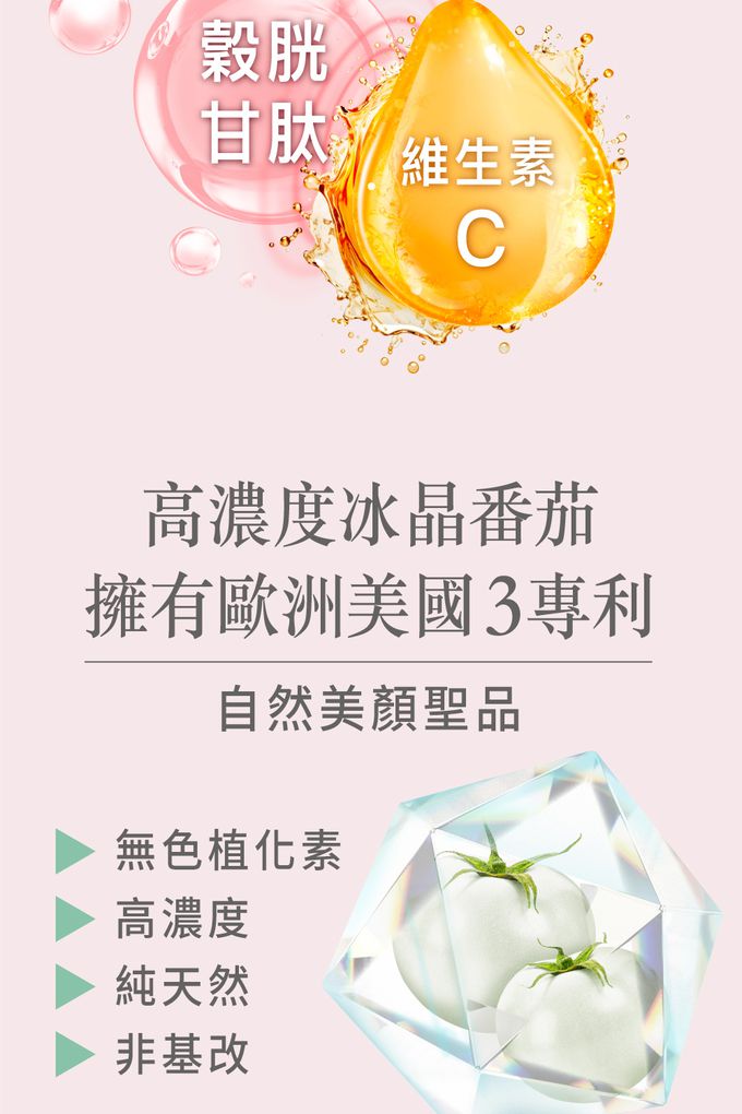 成分:專利冰晶番茄 白晳密碼 專利穀胱甘肽 新陳代謝小尖兵 專利葡萄籽萃取 良好代謝調節力 琉璃苣油 生理守護者 白藜蘆醇 重啟青春活力