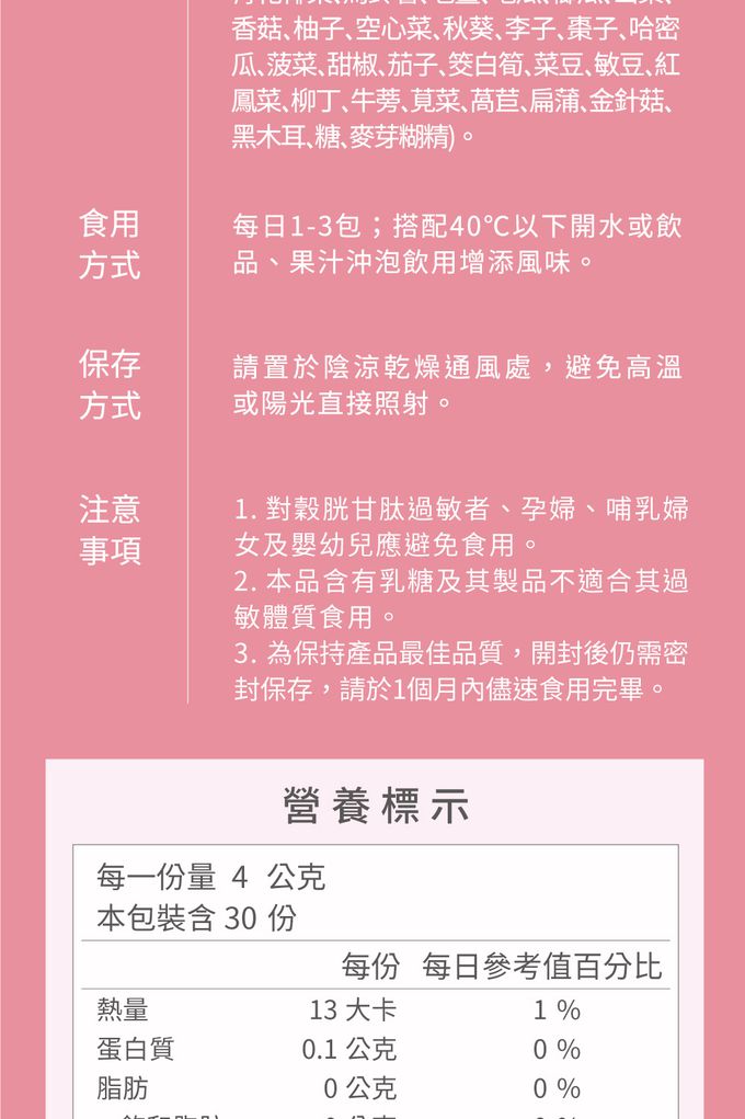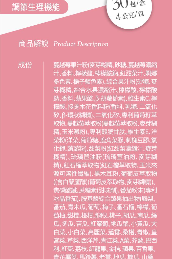 食品添加物名稱:葡萄糖、蔓越莓果汁粉、麥芽糊精、綜合果汁粉、維生素C、檸檬酸、香料粉、果寡糖