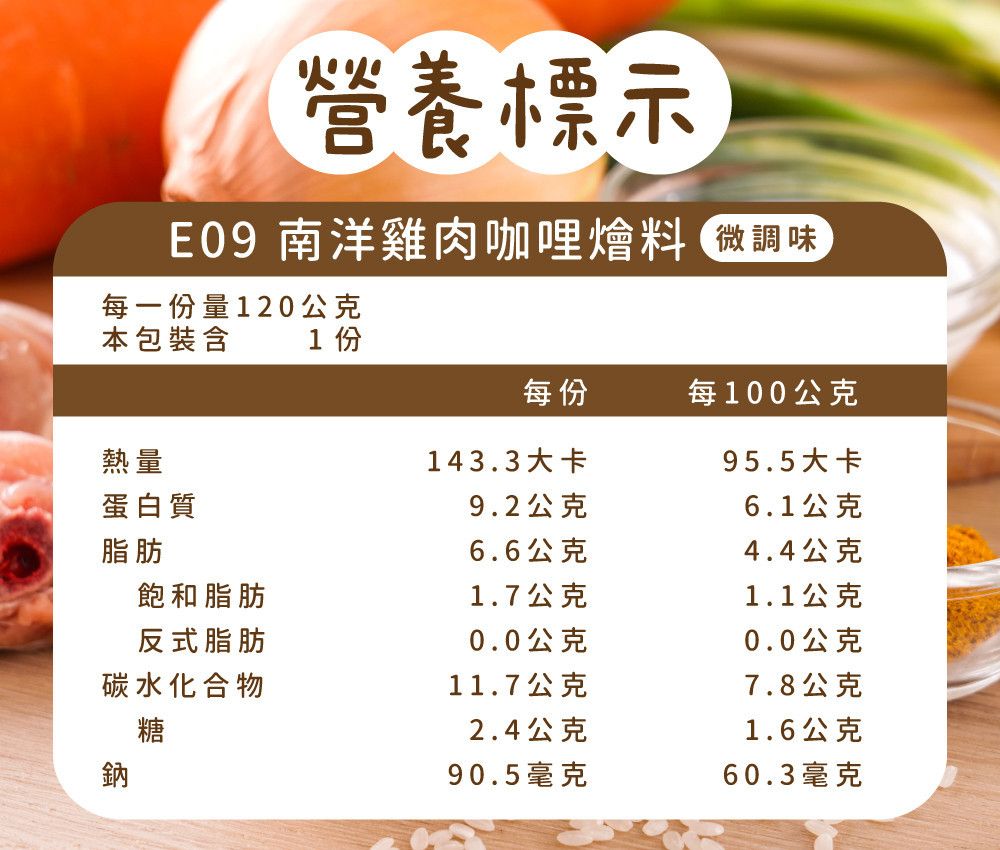 | 內 容 物 | 雞骨高湯(水、雞骨、蔥、薑)、雞絞肉、馬鈴薯、椰奶(椰子萃取物、水)、紅蘿蔔、洋蔥、青豆仁、馬鈴薯粉、橄欖油、薑黃粉、咖哩粉(胡荽、薑黃、薑母、馬芹子、小荳蔻、葛婁子、葫蘆巴、蒜粉、黑胡椒、肉桂、丁香、紅辣椒、荳蔻、小茴香、月桂葉) |