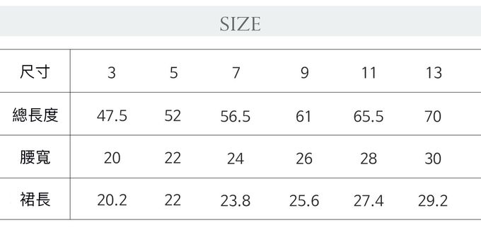 1. 尺寸表單位皆為公分(cm),實際尺寸會因布料彈性、水洗、測量起訖點等因素略有誤差。