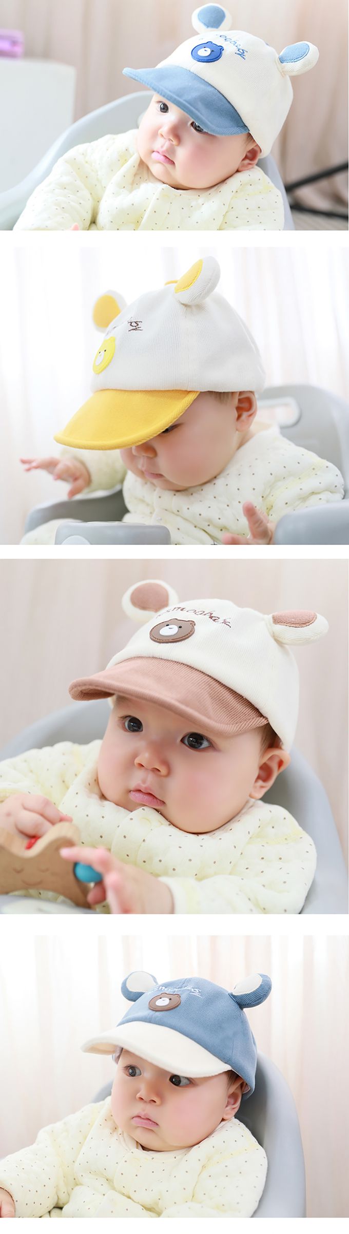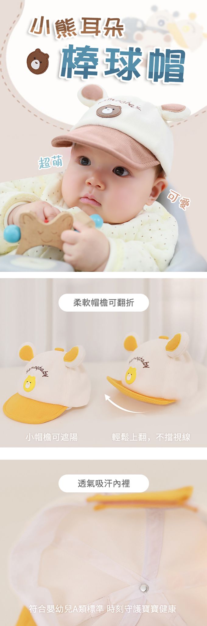 3.帽檐遮陽擋光可翻折,保護寶寶的眼睛。