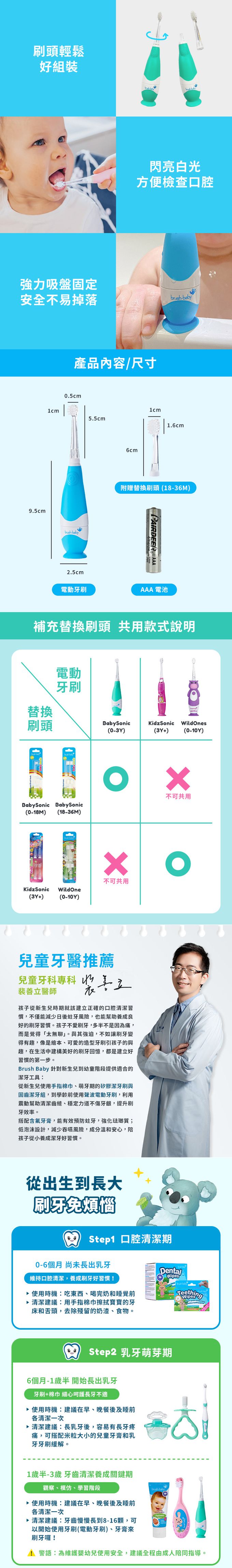 商品內含:牙刷主體,刷頭(0-18個月)/ 替換刷頭x1(18-36個月) /3A 1.5V電池x1