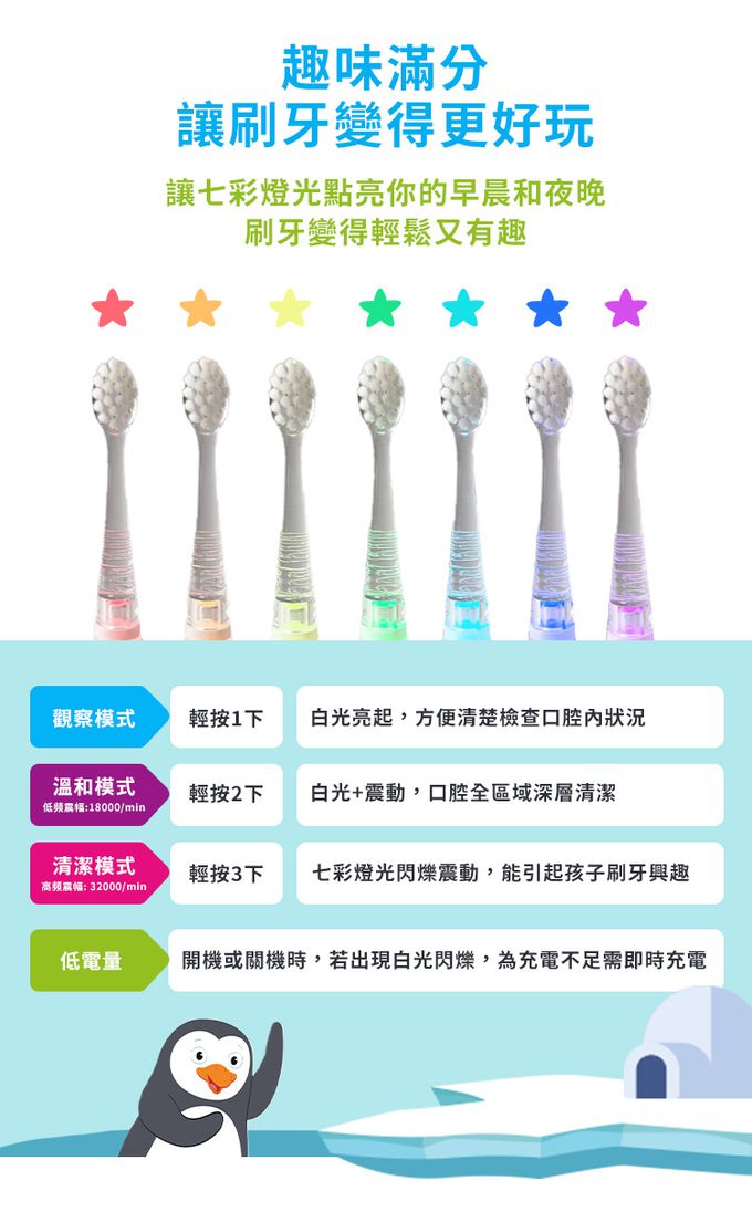 清潔模式:輕按3下,七彩閃爍,高頻震動,能引起孩子刷牙興趣。