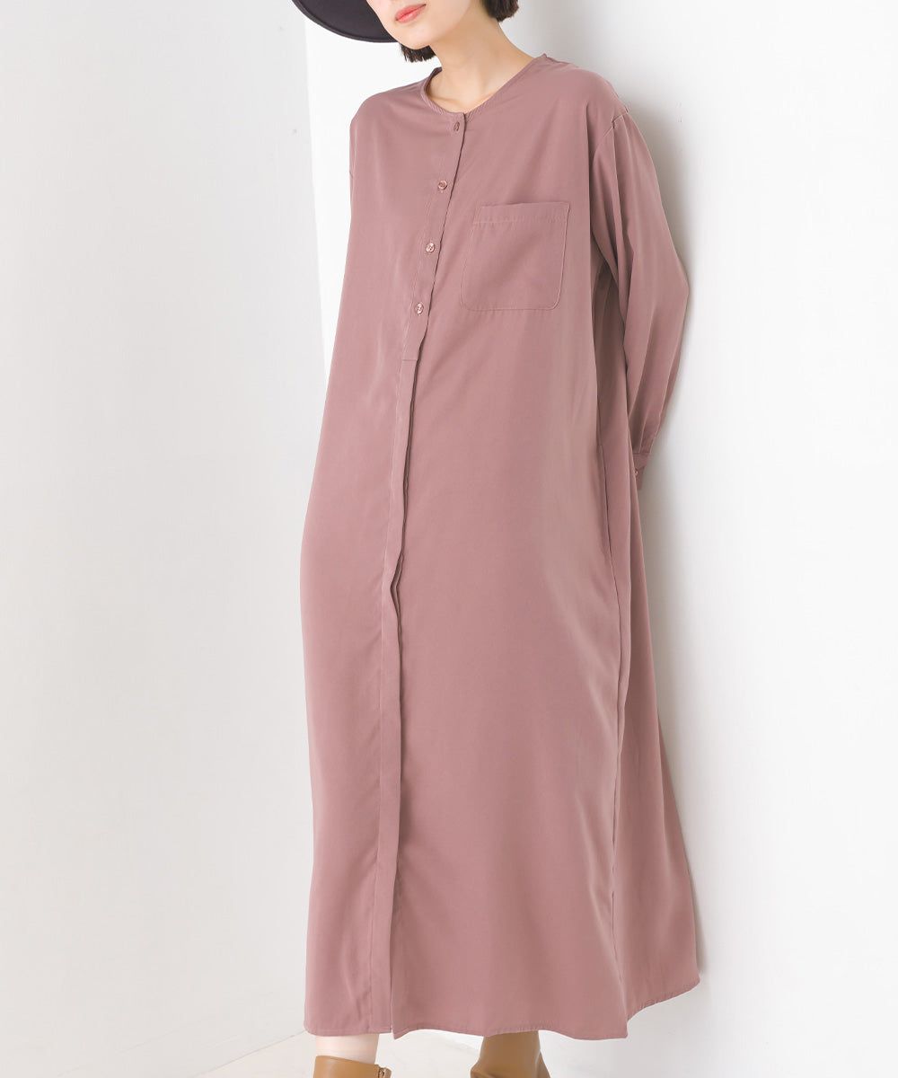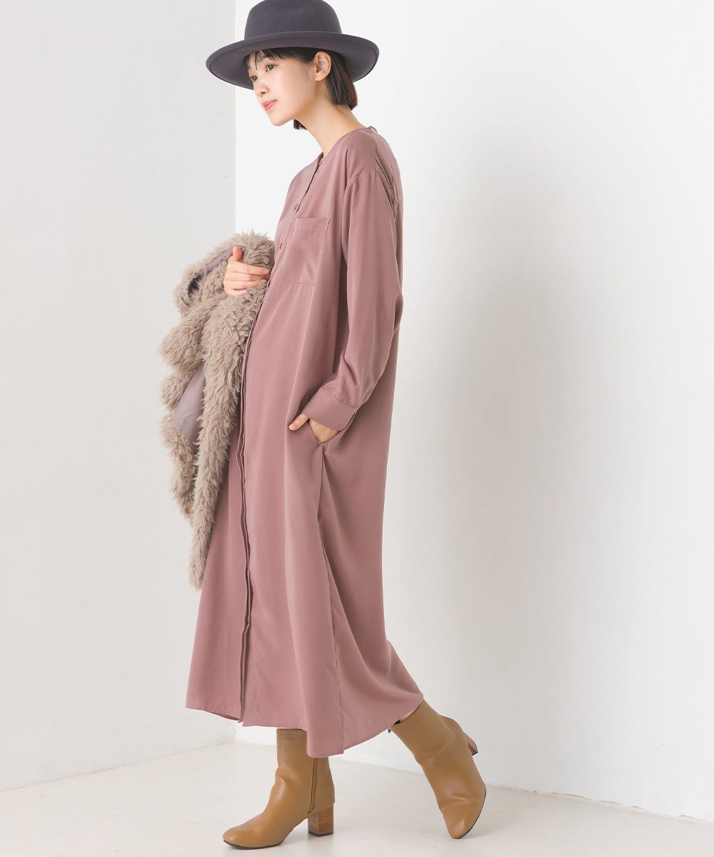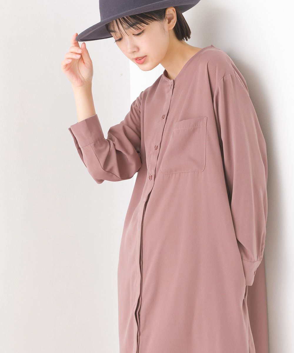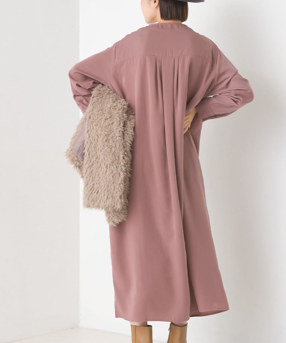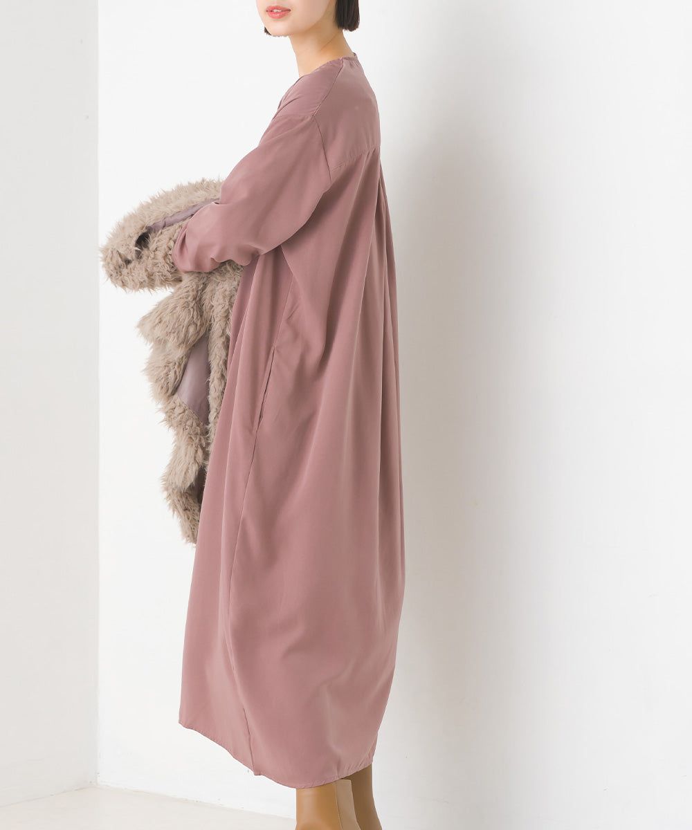 日本 OMNES - 桃皮絨柔滑休閒後打褶長袖洋裝-藕粉