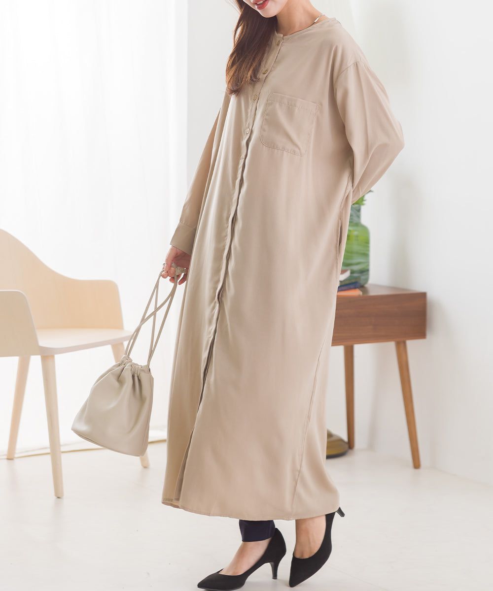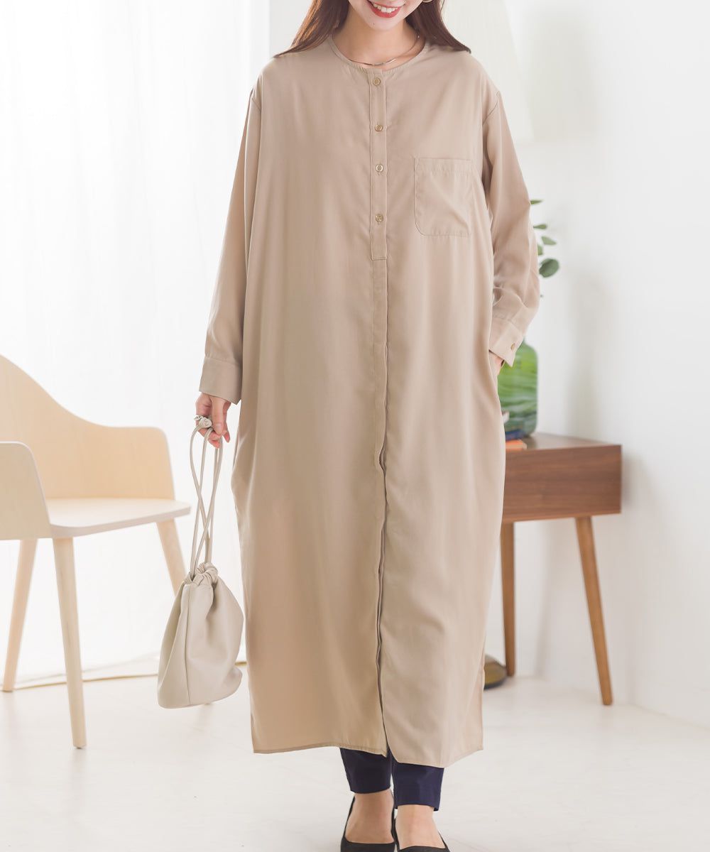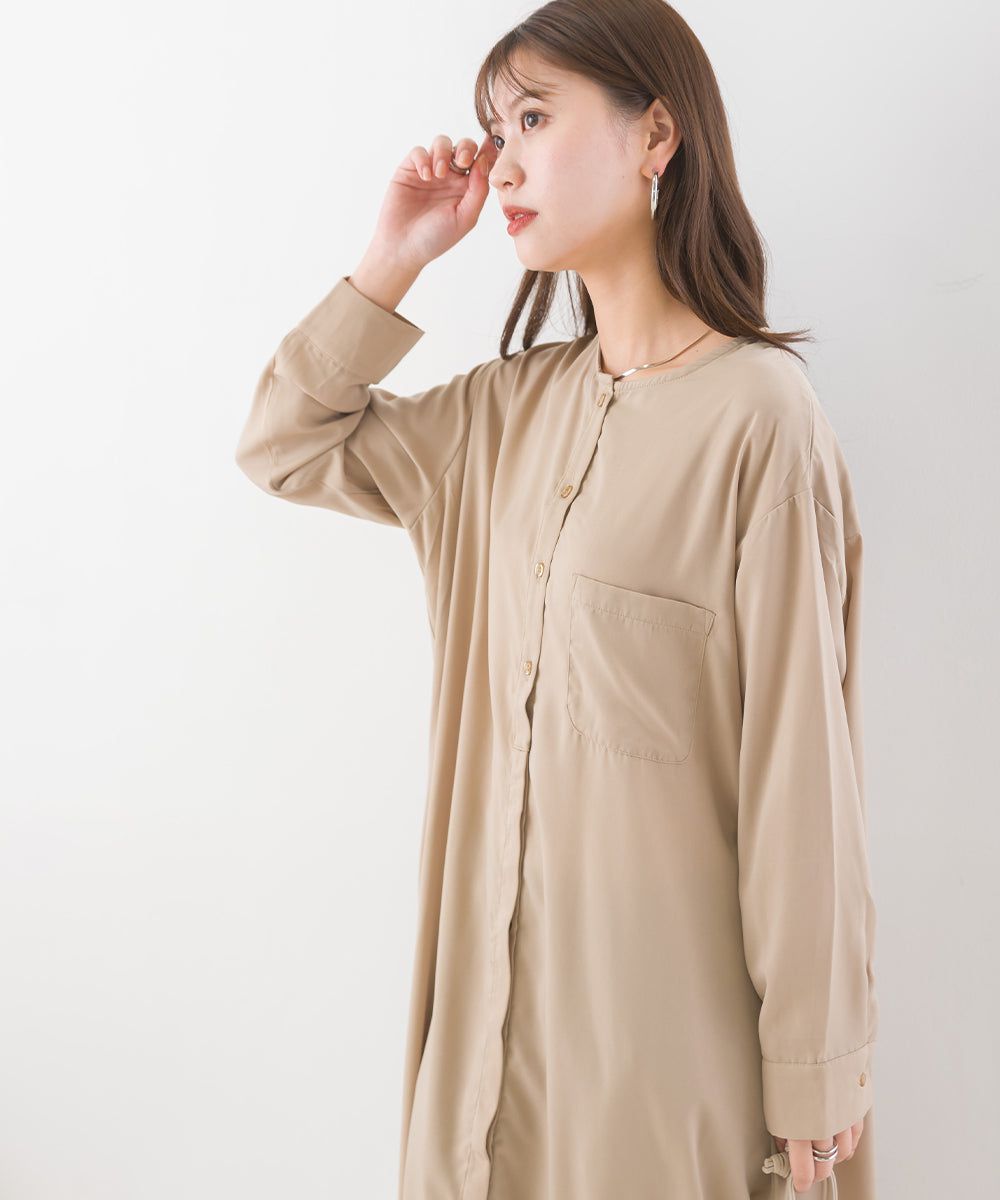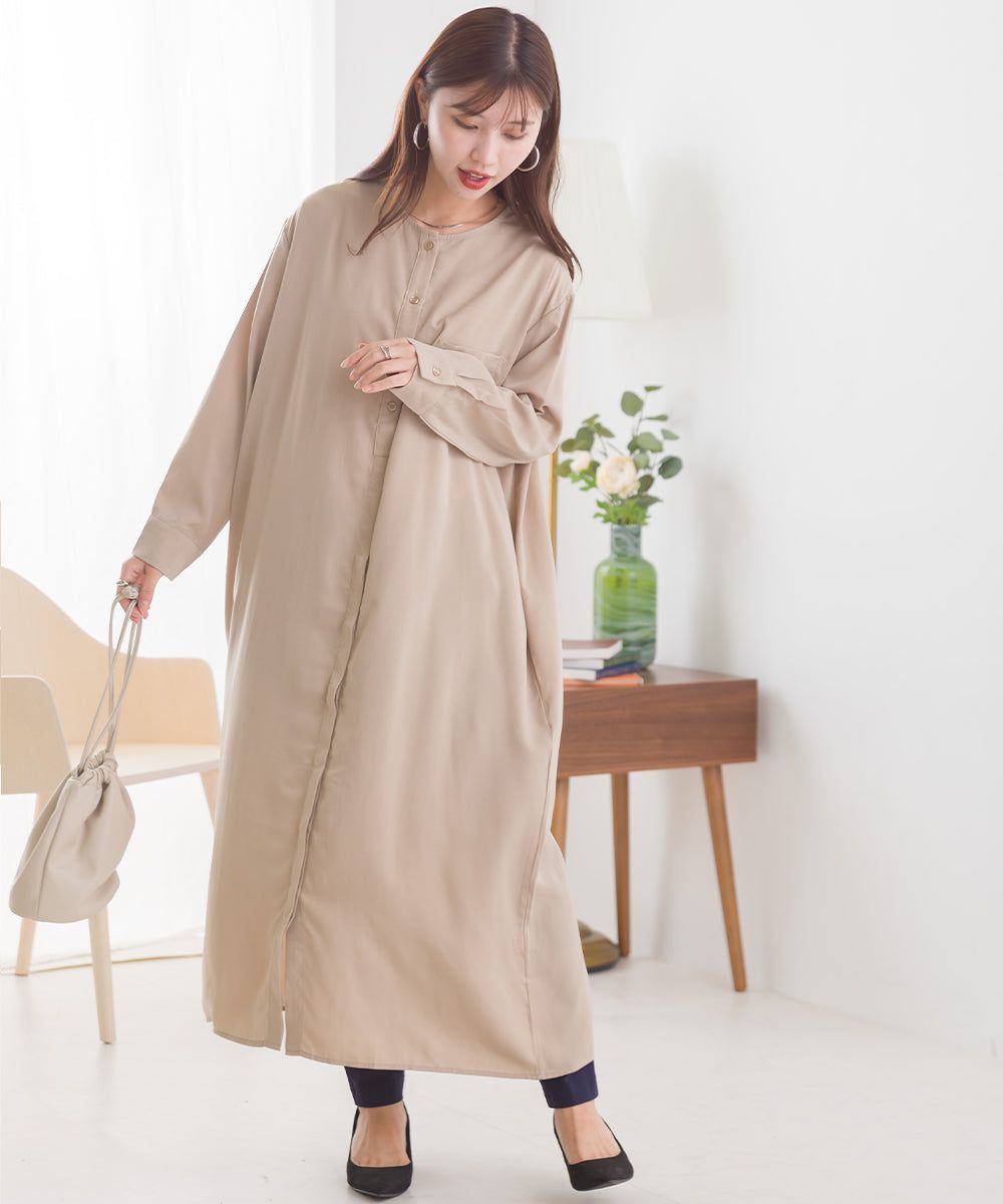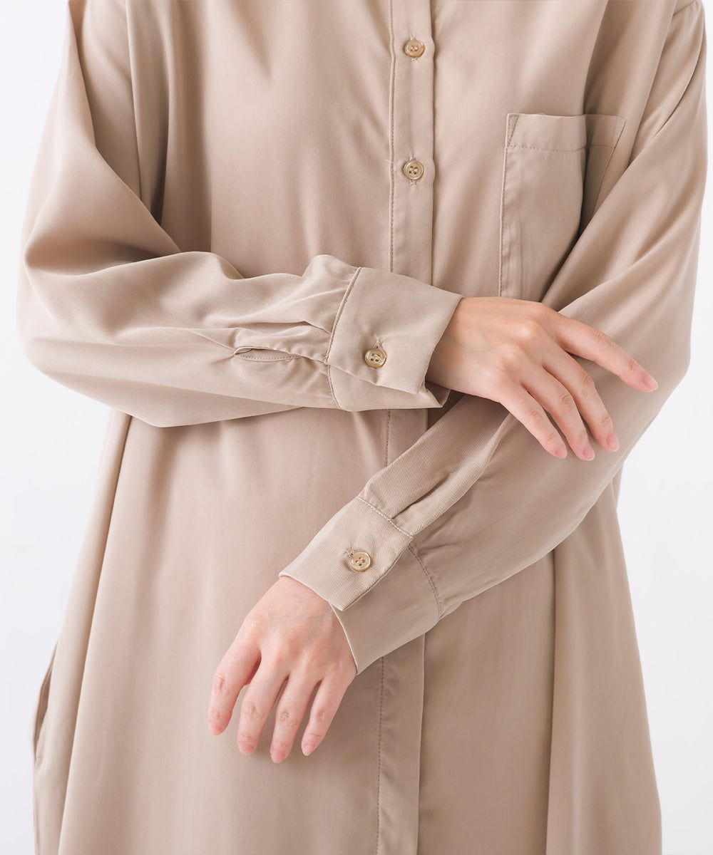 日本 OMNES - 桃皮絨柔滑休閒後打褶長袖洋裝-藕粉