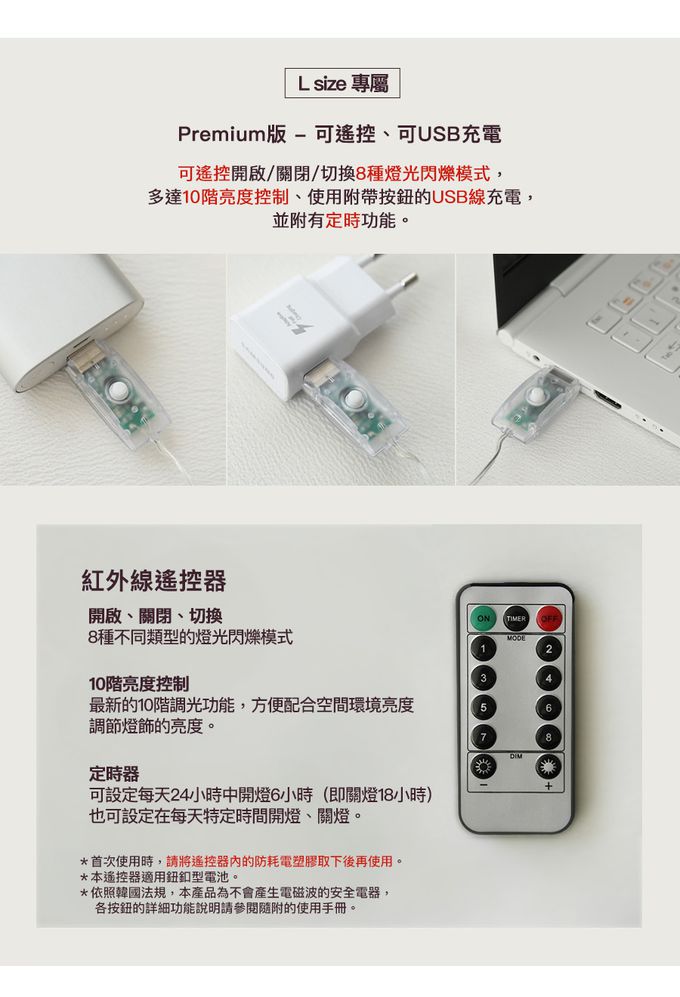 *僅L size的燈泡組配有遙控器,可透過遙控器更輕鬆地切換開關或閃爍模式。除此之外,還有8種燈光閃爍模式,可依據情境享受多種類型的氣氛燈模式,創造一個溫馨、溫暖的空間。