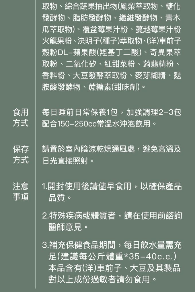 成分:GABA(米糠發酵物)、fibersol-2玉米纖維、專利AES酵素、綜合蔬果抽取物、龍根菌