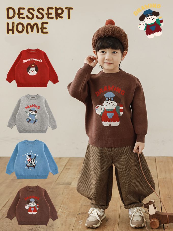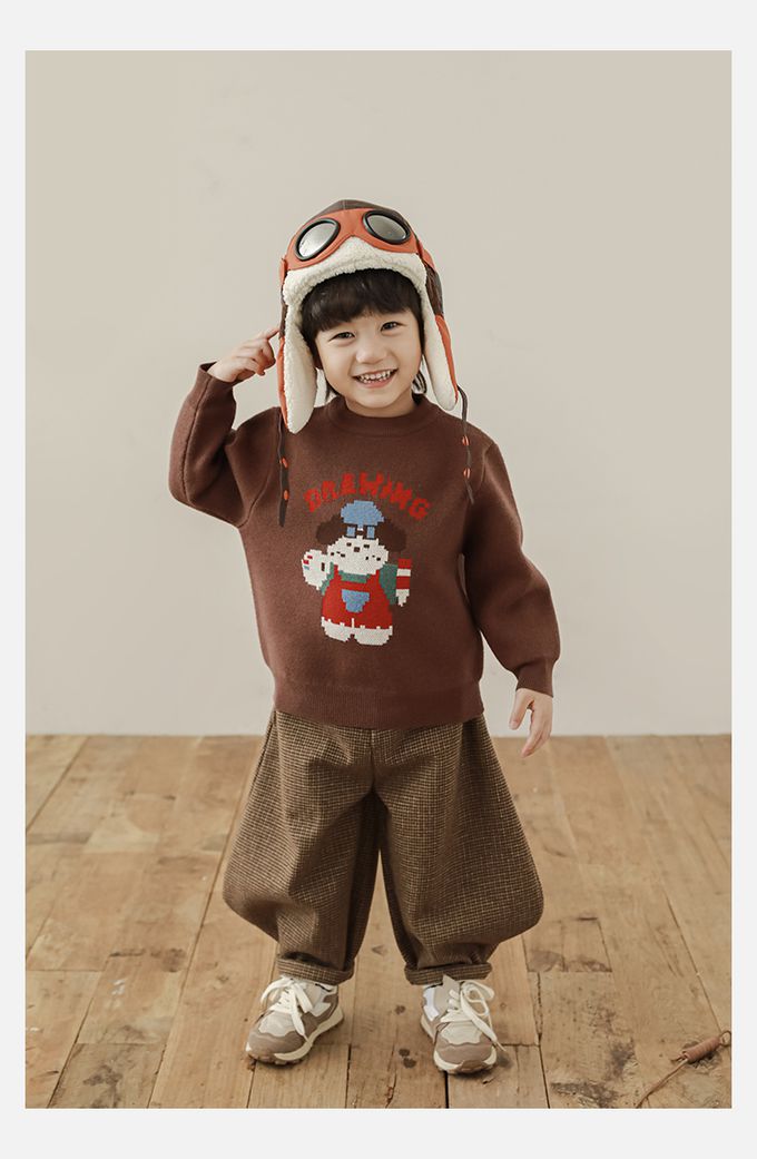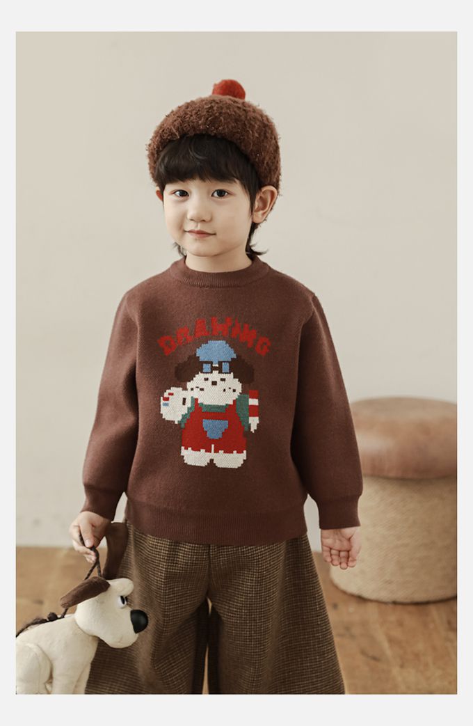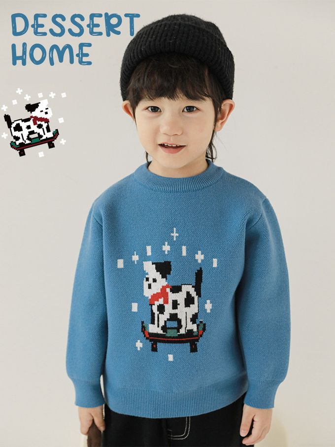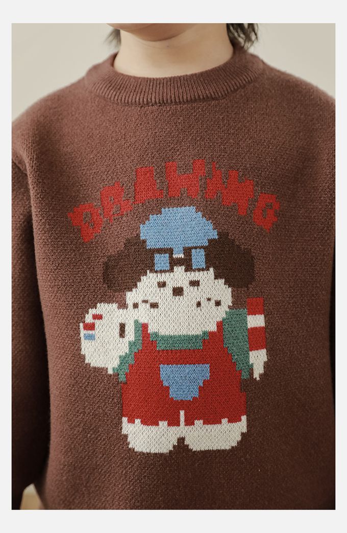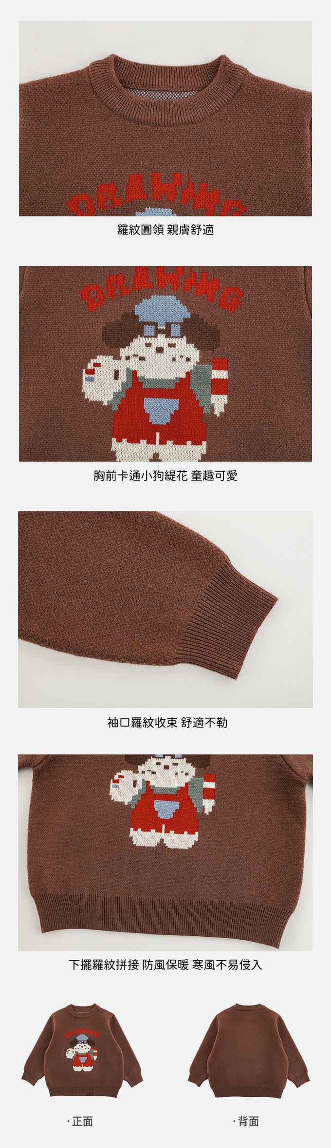 圓領長袖針織上衣/毛衣-數位像素小狗-咖啡色