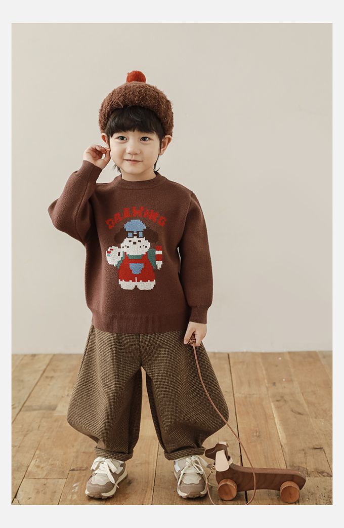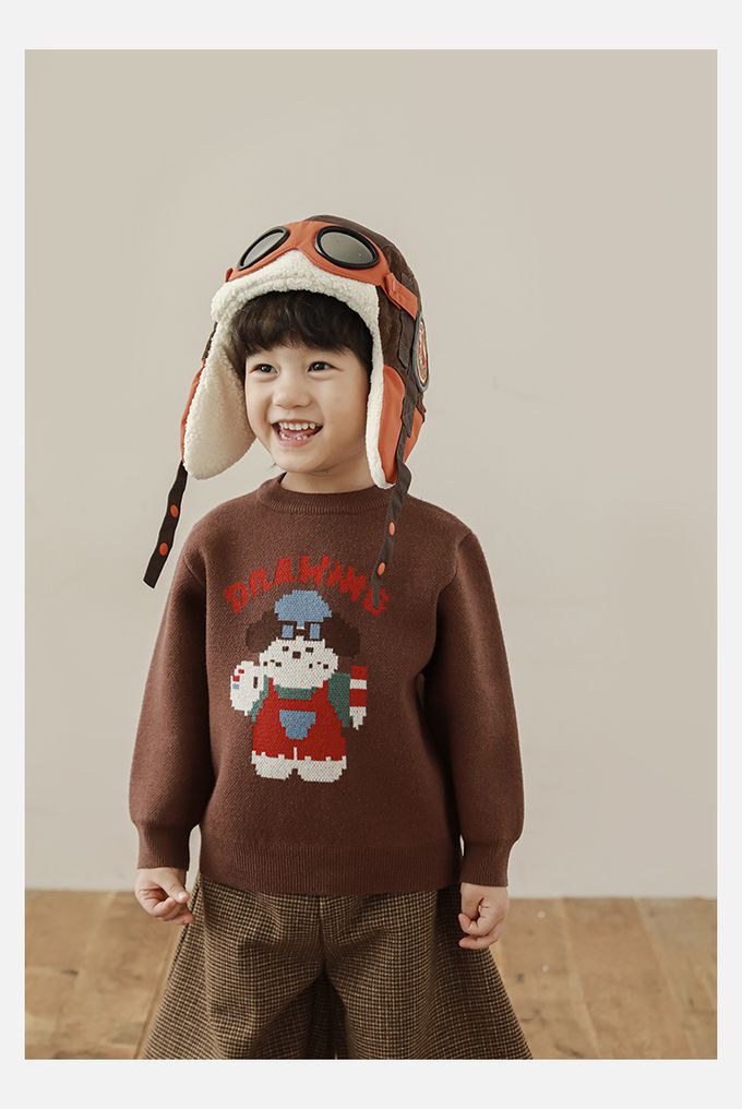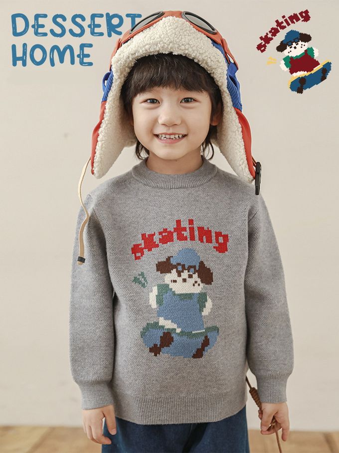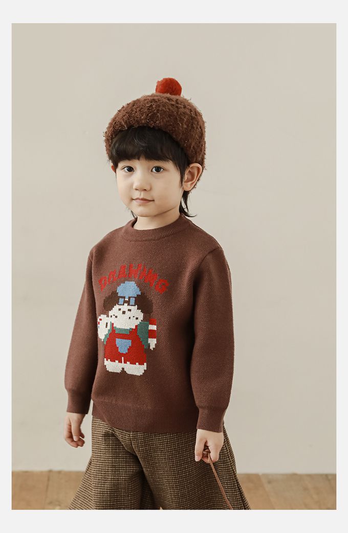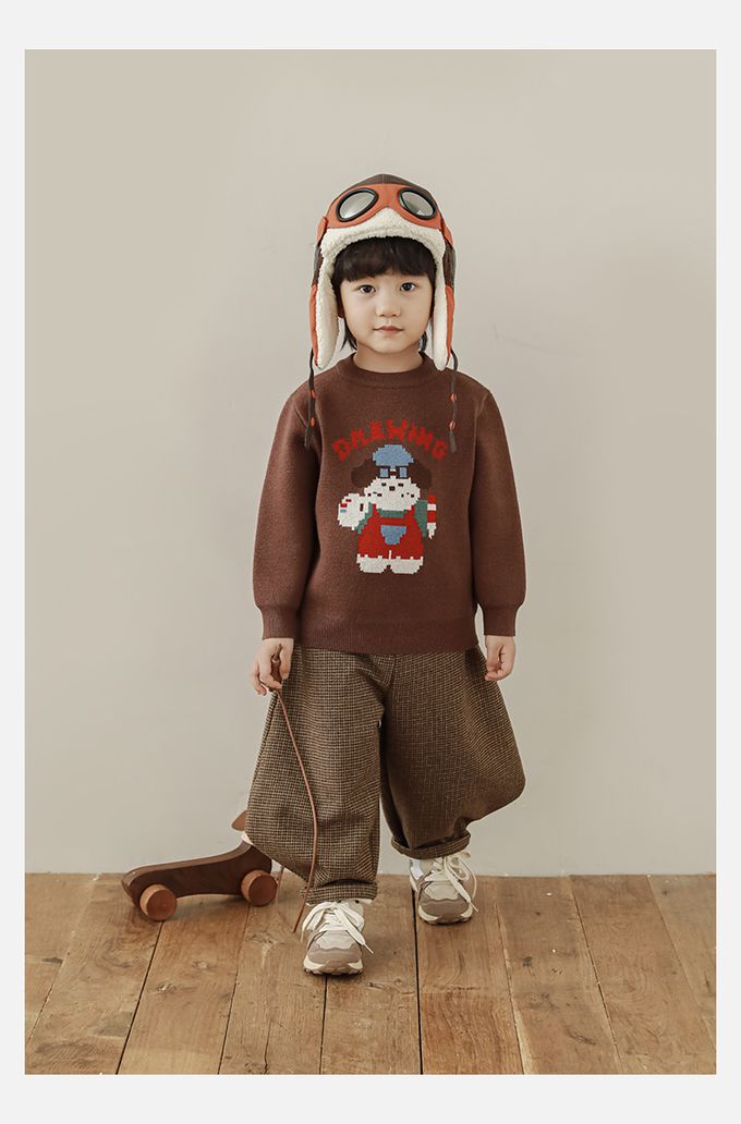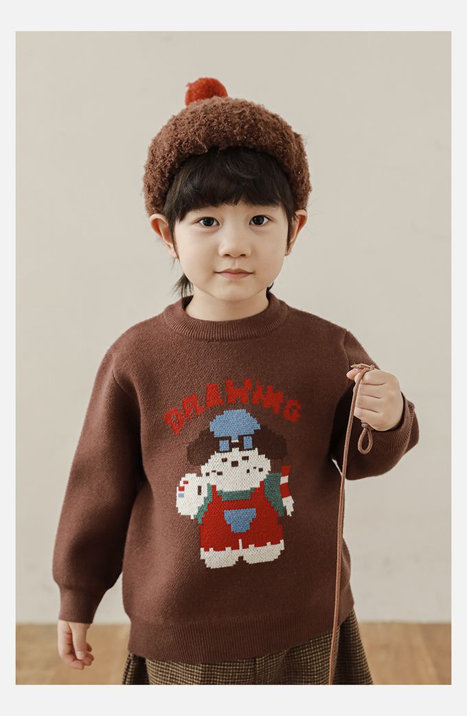圓領長袖針織上衣/毛衣-數位像素小狗-咖啡色