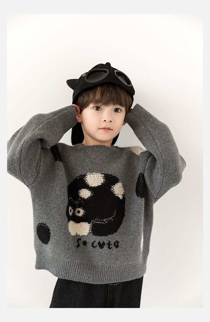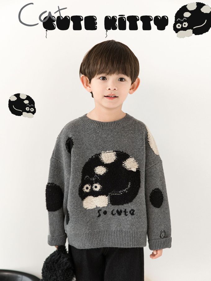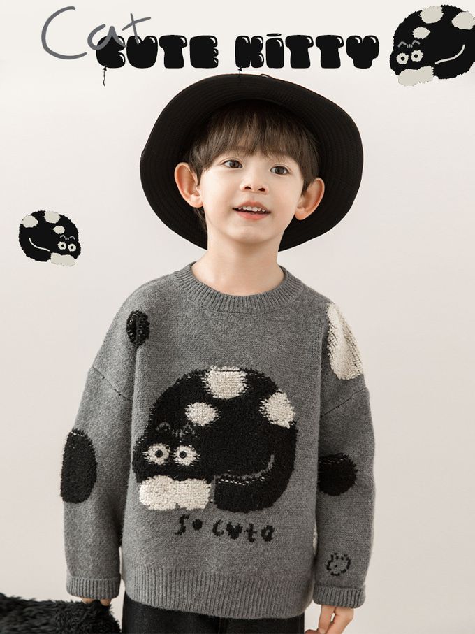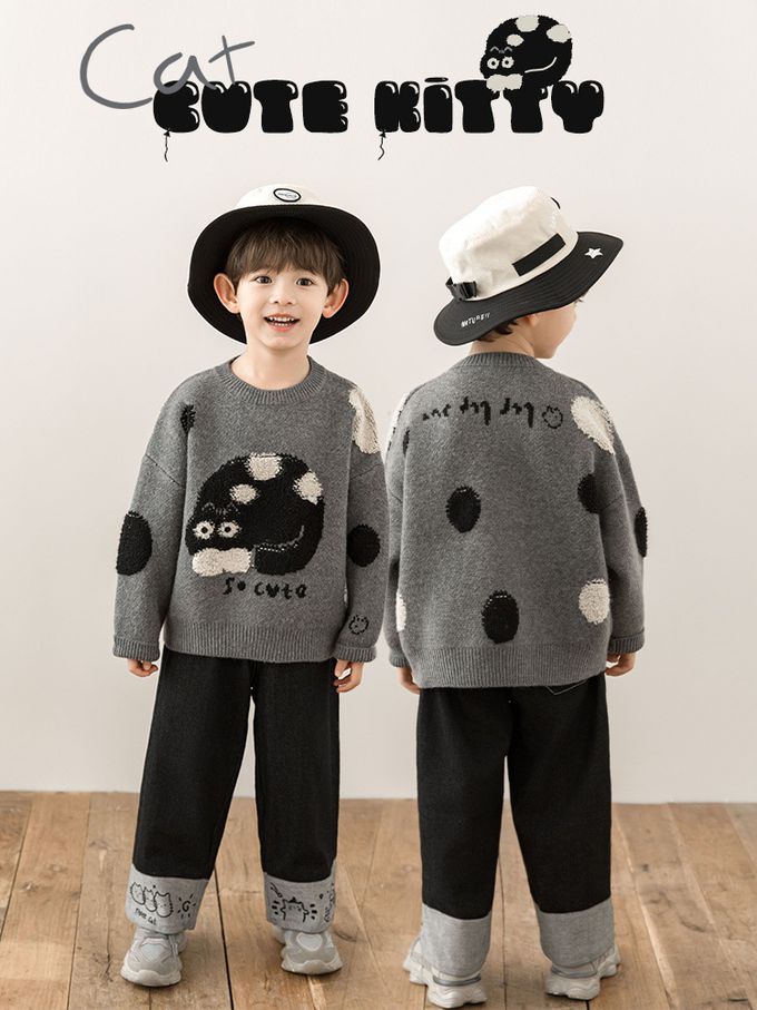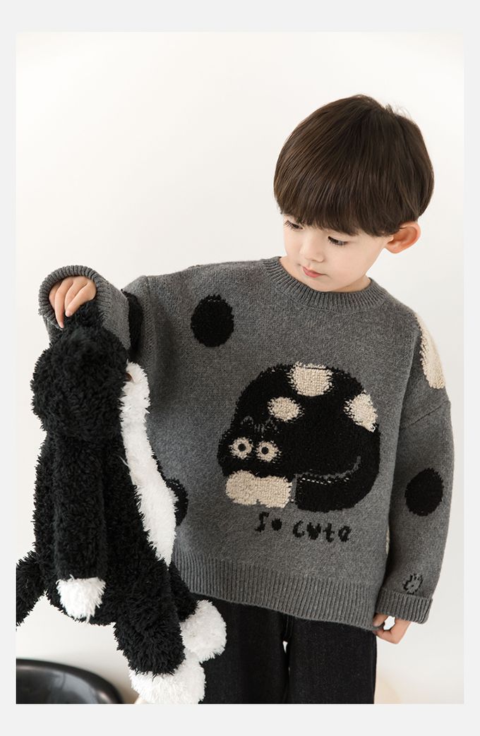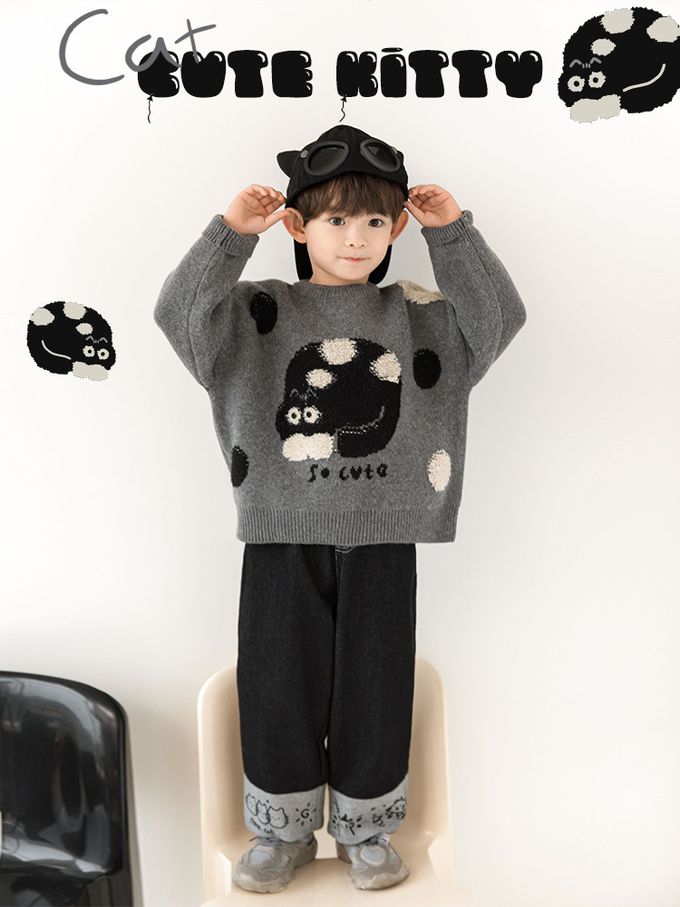 抗起球圓領長袖針織上衣/毛衣-毛巾繡黑貓-灰色