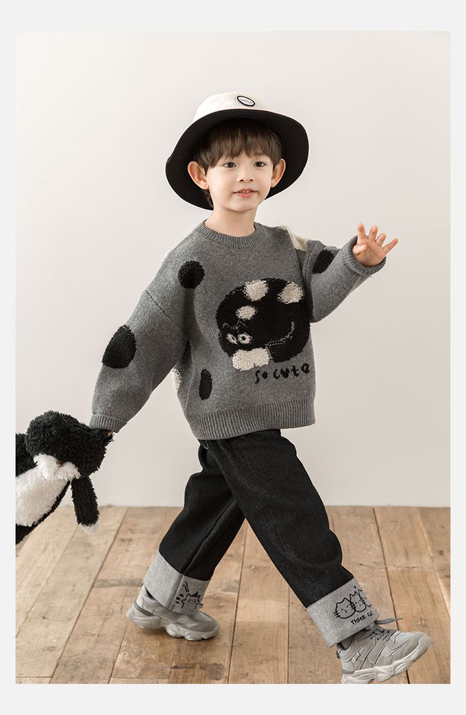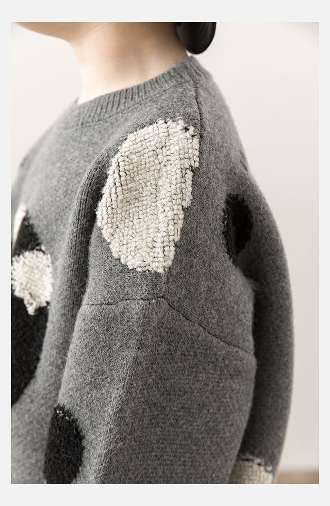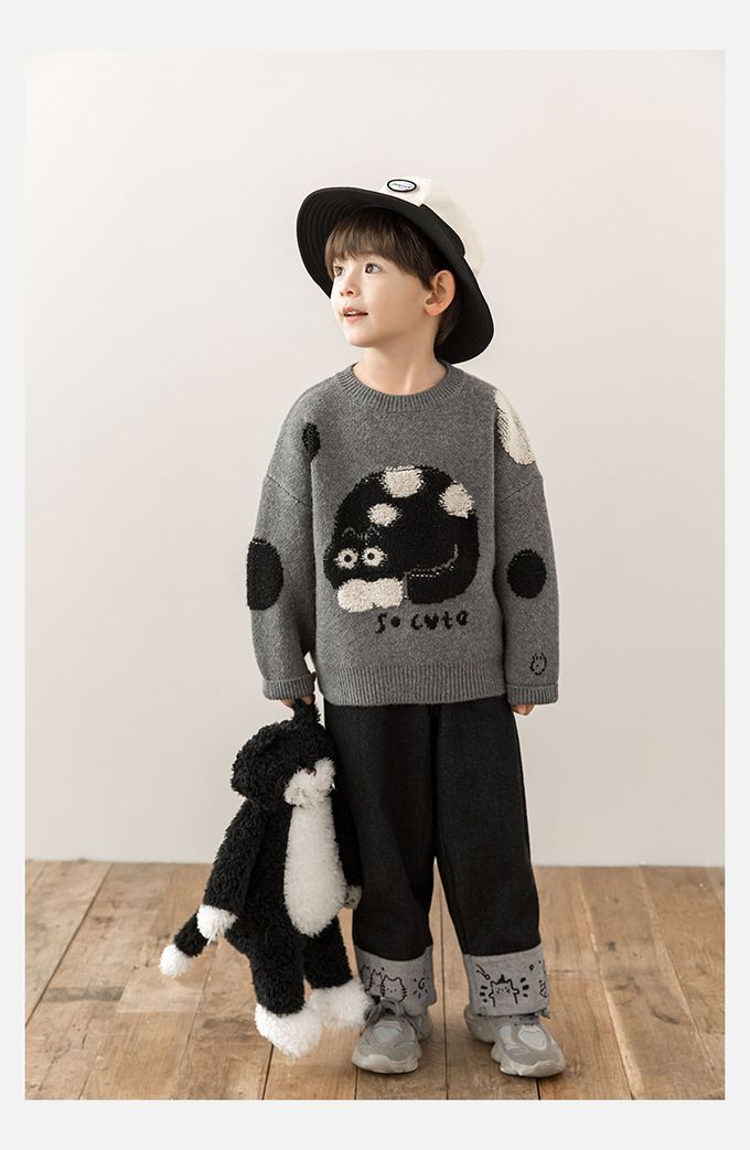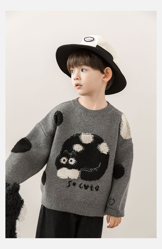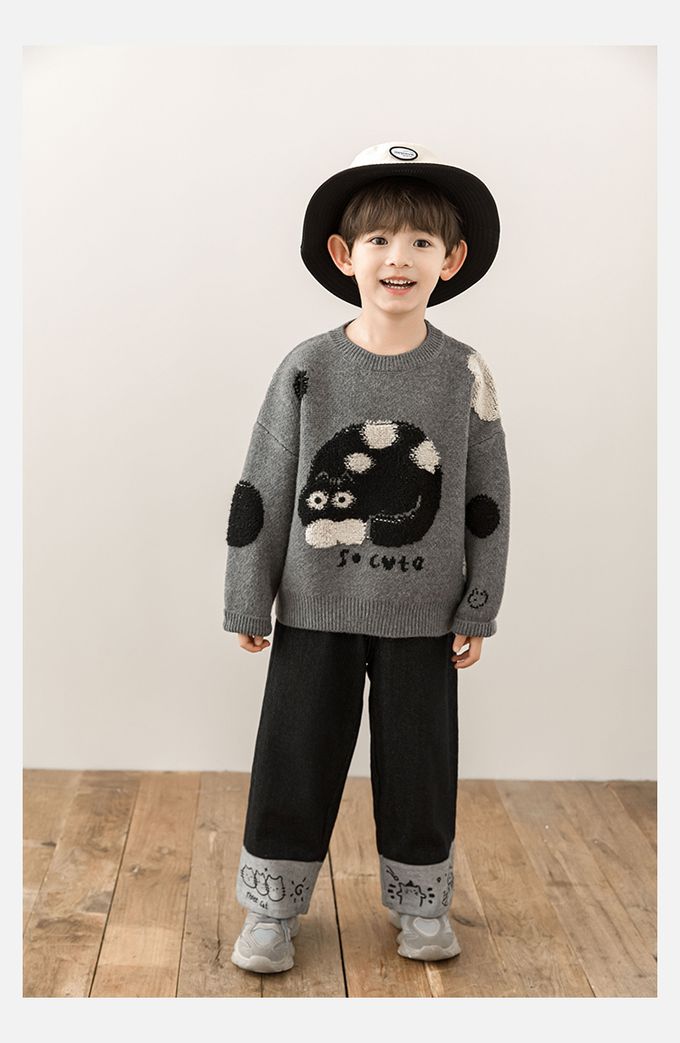 抗起球圓領長袖針織上衣/毛衣-毛巾繡黑貓-灰色