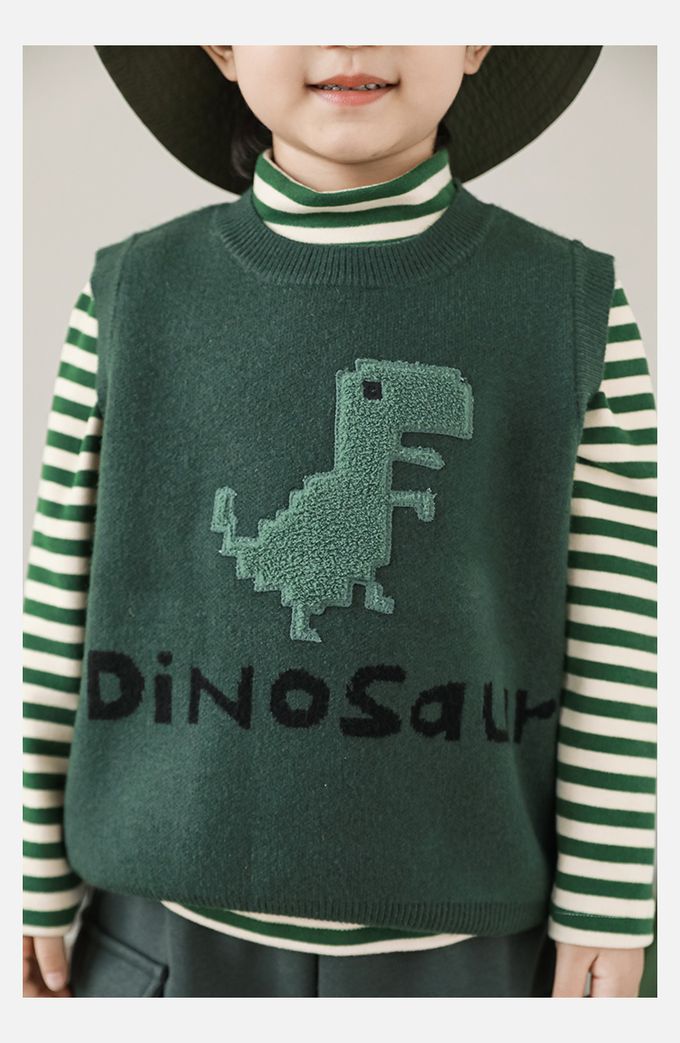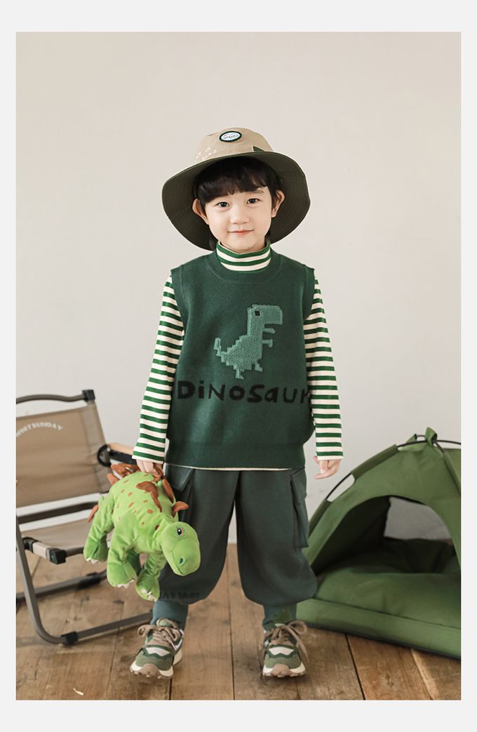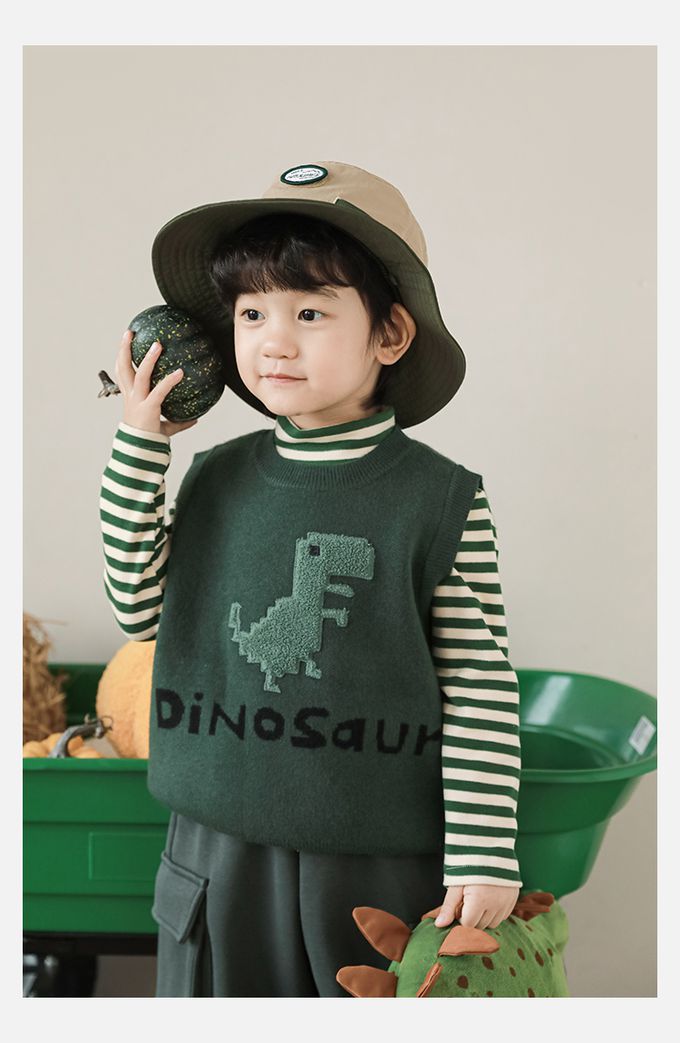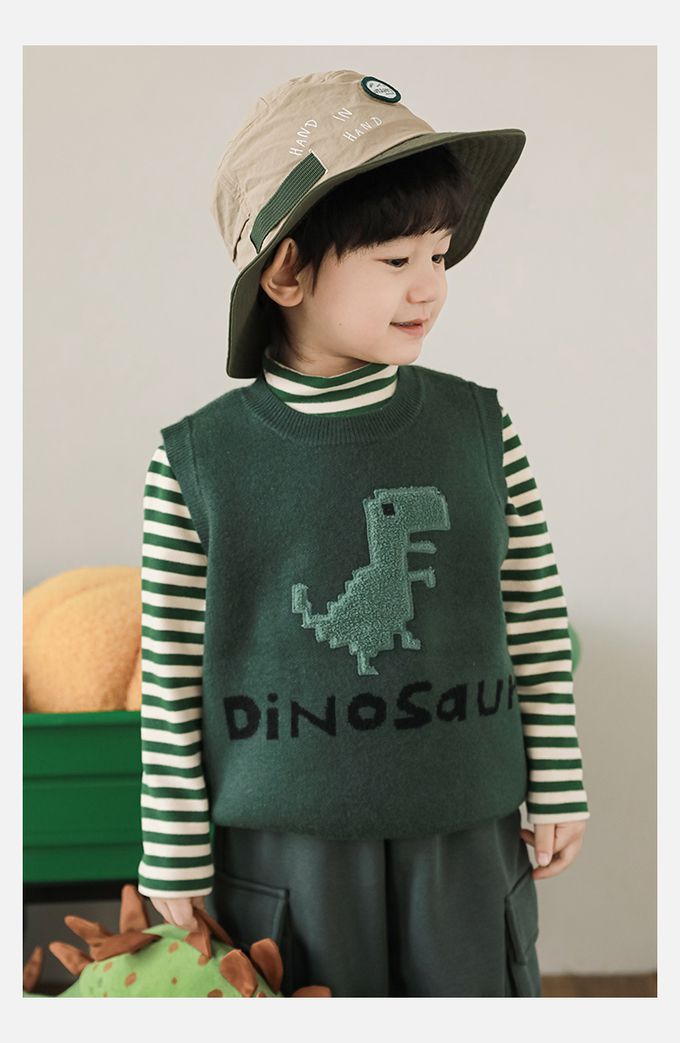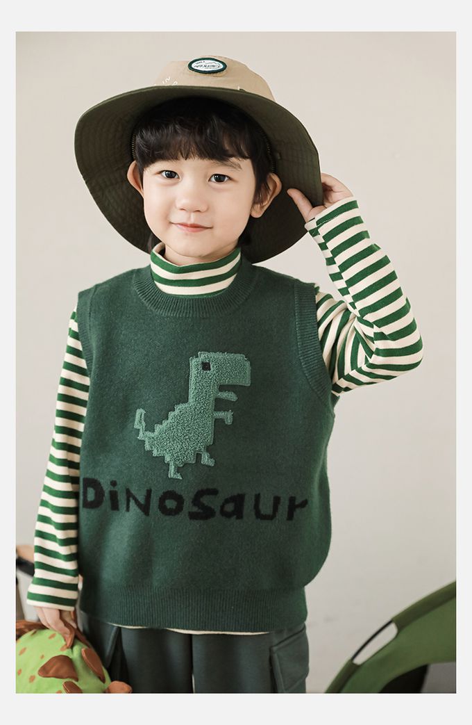 抗起球圓領針織背心-立體毛絨恐龍-軍綠色