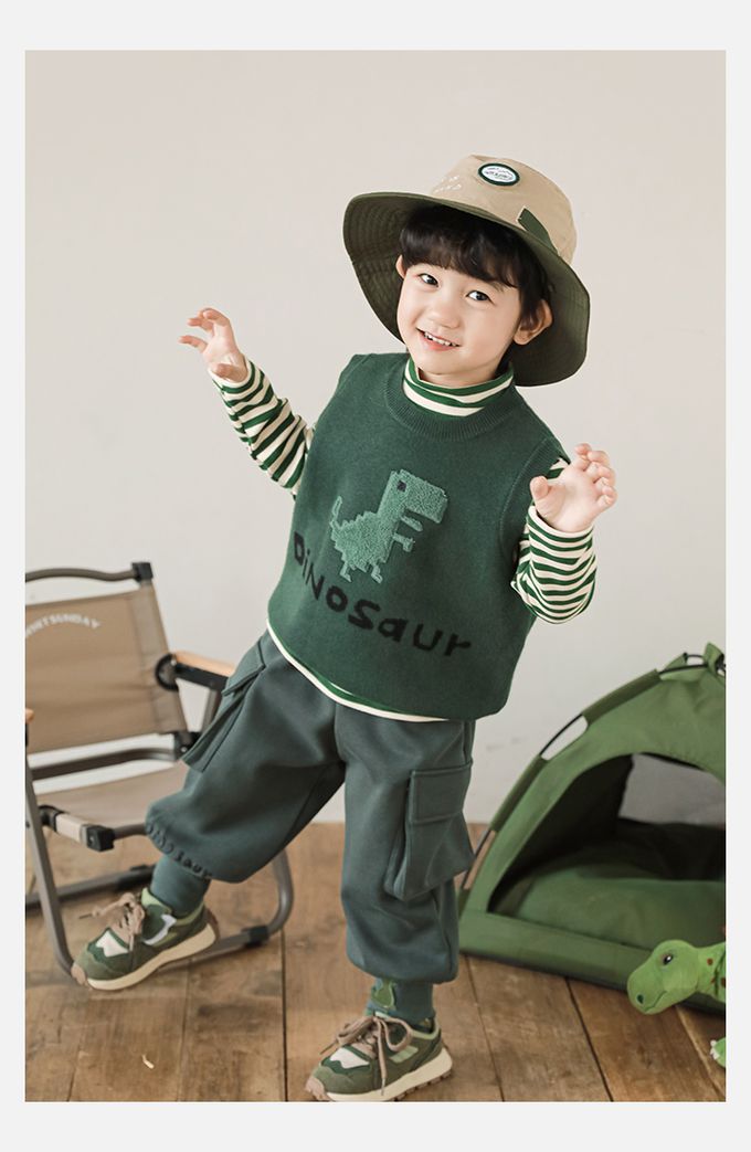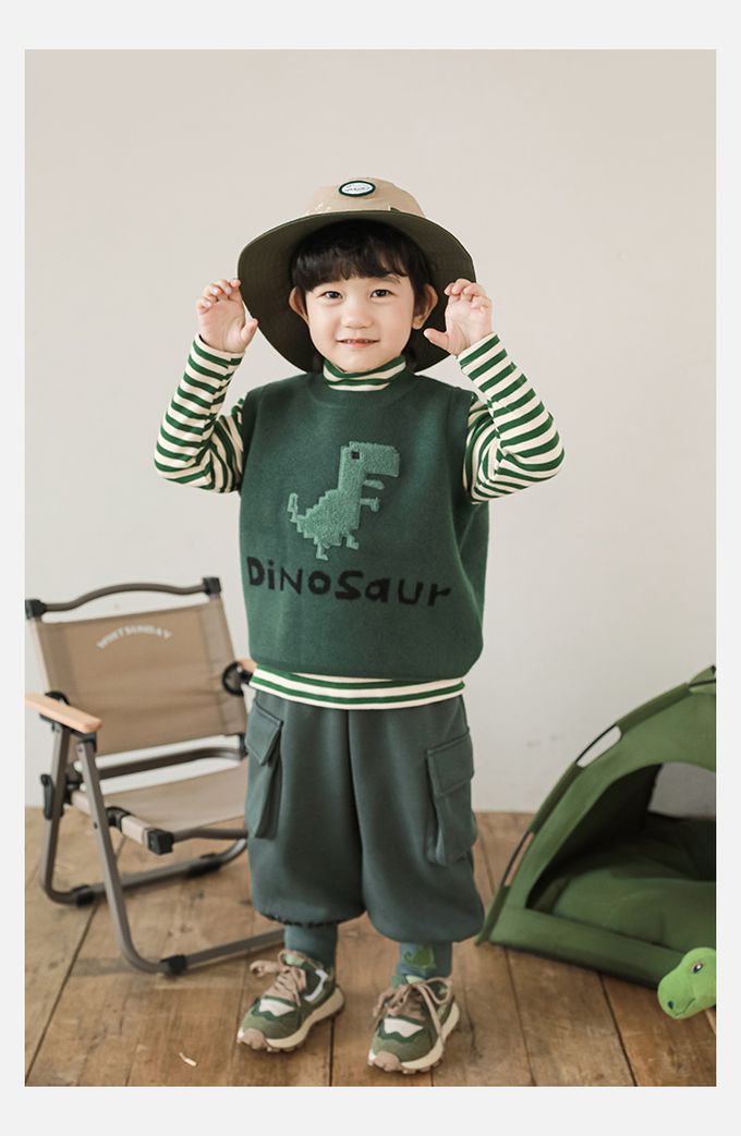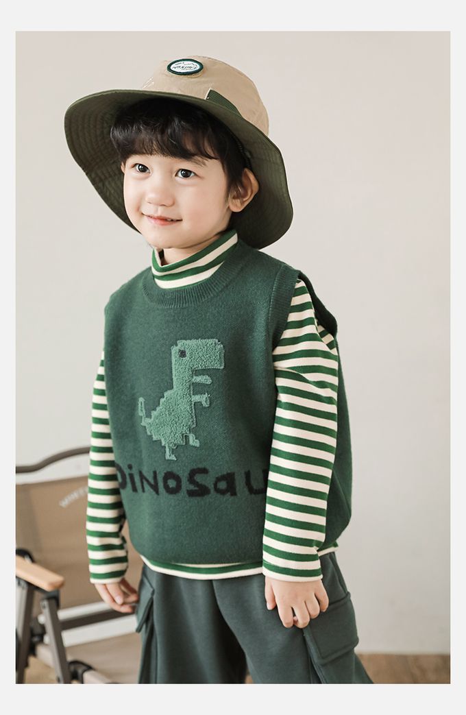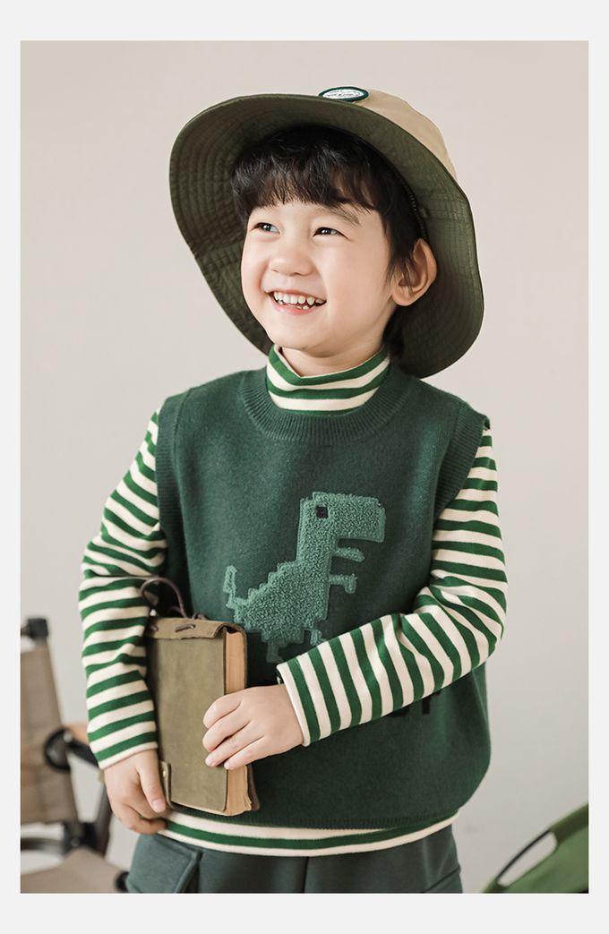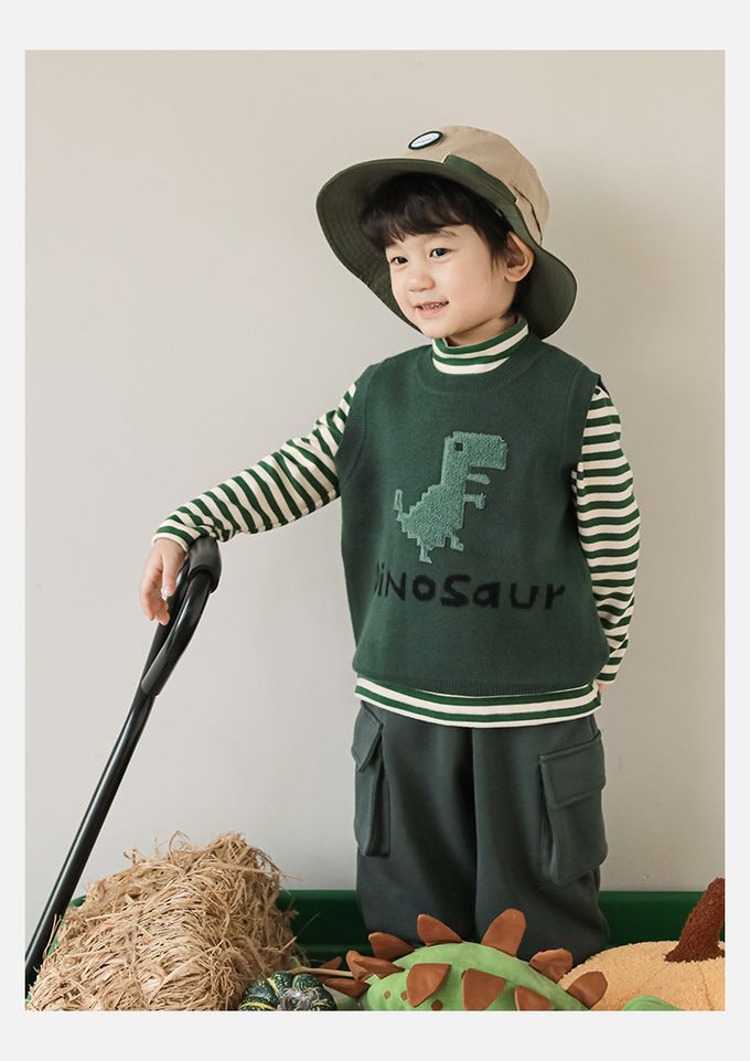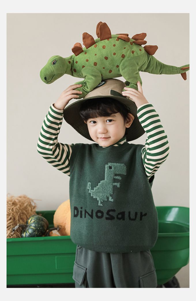 抗起球圓領針織背心-立體毛絨恐龍-軍綠色